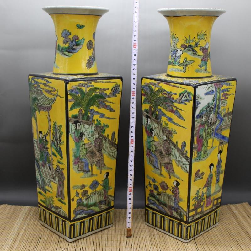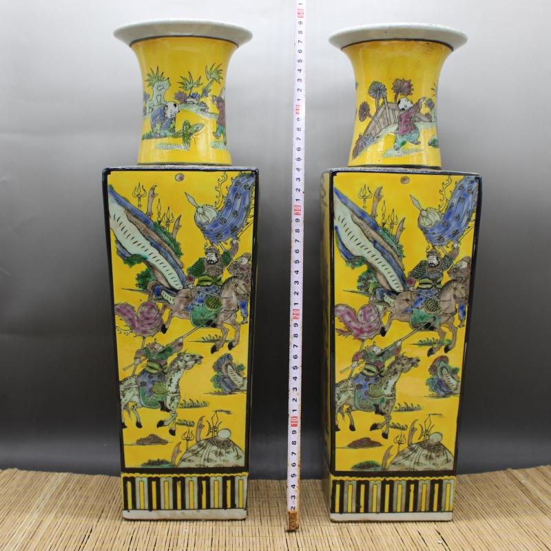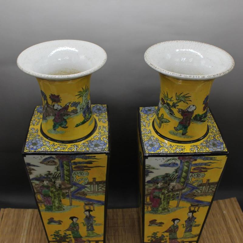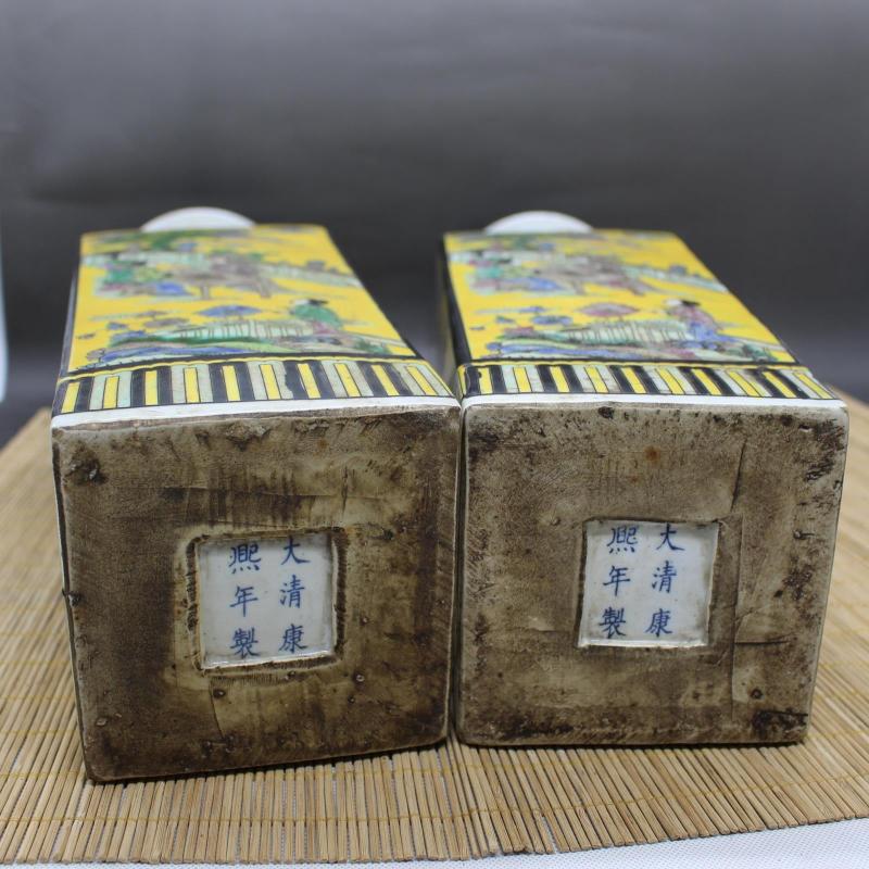 清康熙黃地粉彩人物故事天圓地方花瓶 老貨收藏仿古瓷器古玩擺件1入
