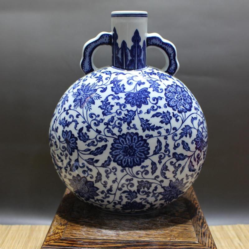 清乾隆青花纏枝蓮紋扁瓶 手繪仿古景德鎮官窯瓷器 古玩擺件收藏1入
