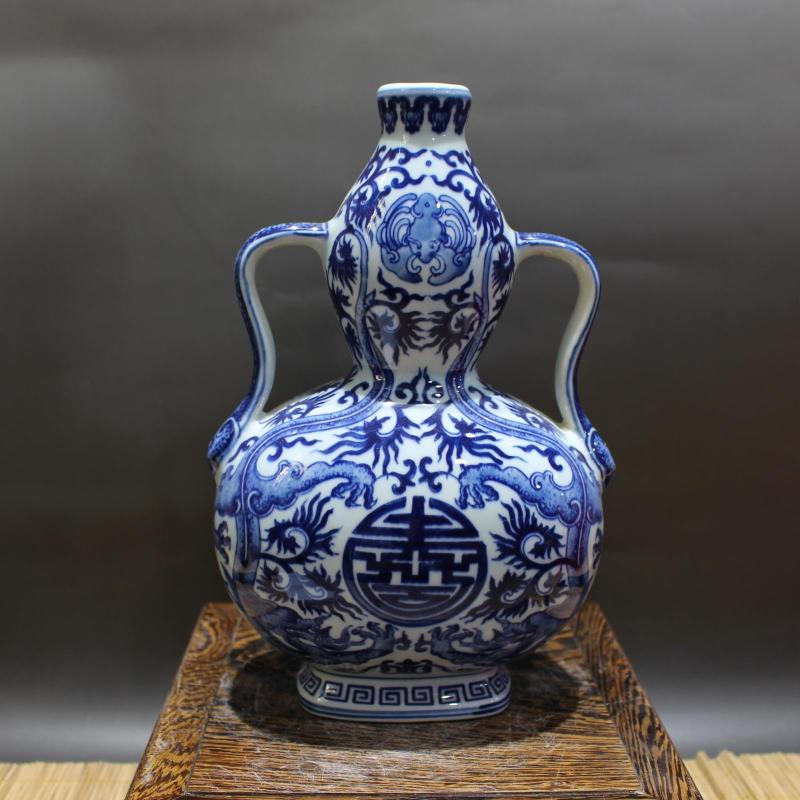 清乾隆青花福壽雙龍紋葫蘆瓶手工民仿官窯景德鎮瓷器擺件古玩收藏1入