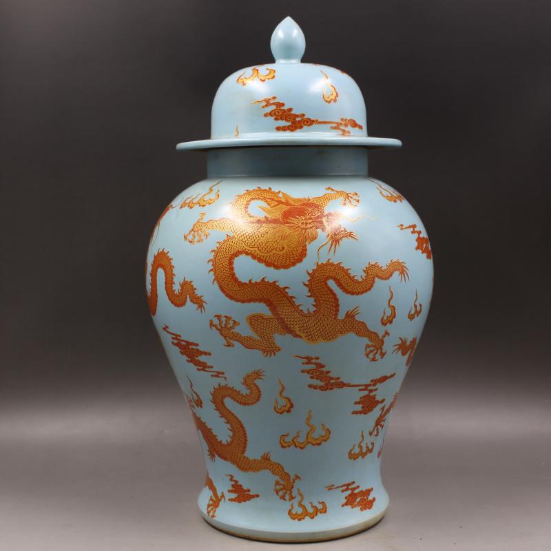 清康熙年制無光釉紅彩描金云龍紋將軍罐擺件仿古出土瓷器古玩收藏1入