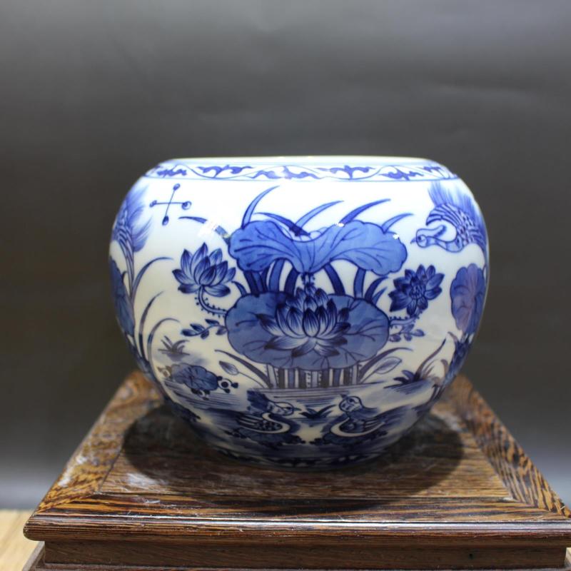 清乾隆年制青花荷花鴛鴦水洗金魚缸 手繪仿古工藝瓷器擺件 古玩1入