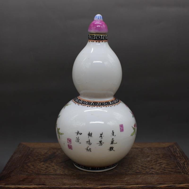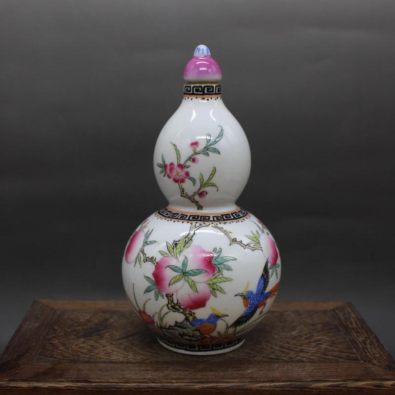 清雍正年制粉彩壽桃紋帶蓋葫蘆瓶 手工仿古工藝瓷器擺件 古玩收藏1入