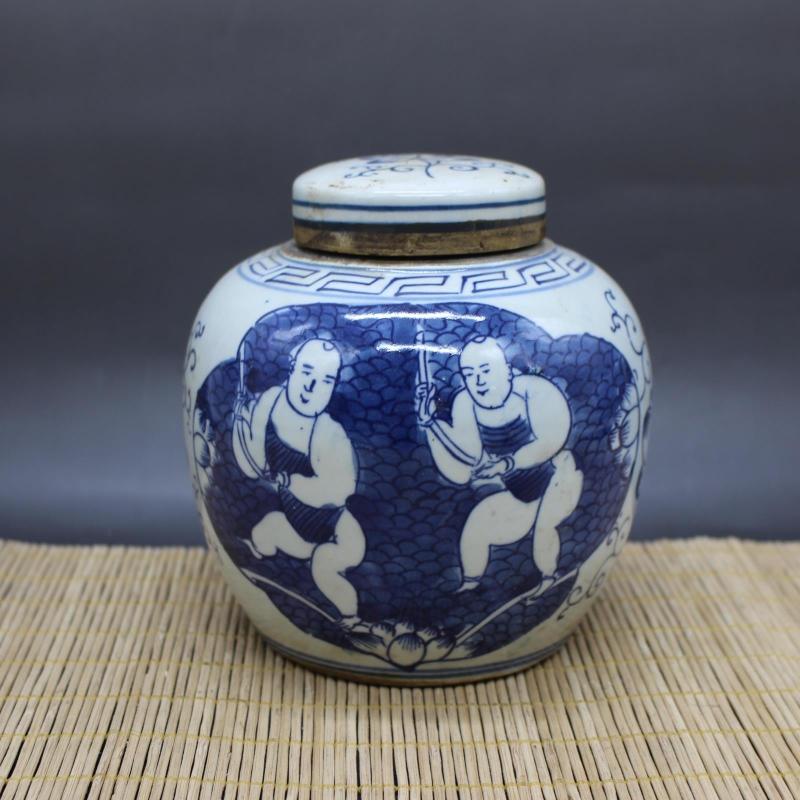 清康熙青花人物嬰戲茶葉罐 仿古老貨瓷器 家居擺件 古董古玩收藏1入