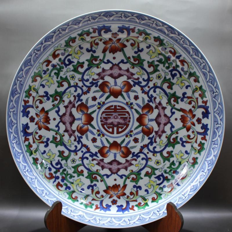 清雍正青花斗彩纏枝蓮福壽大盤 全手工精品家居仿古擺件瓷器收藏1入