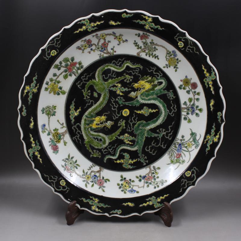 清康熙黑地粉彩四季花紋雙龍戲珠大盤仿古出土瓷器擺件古玩收藏1入