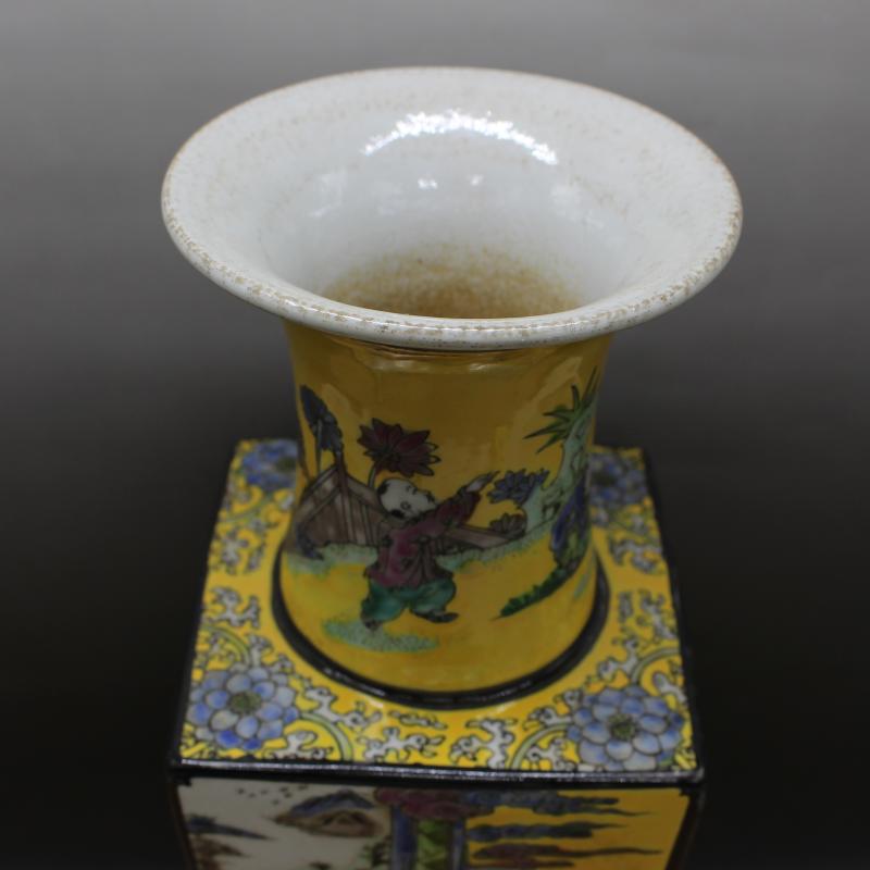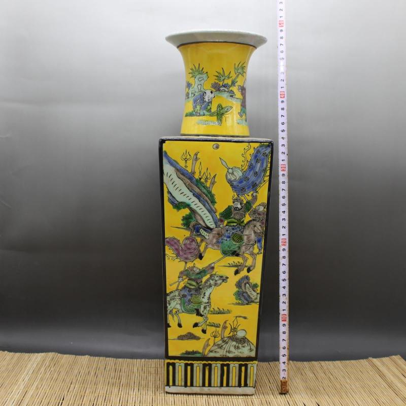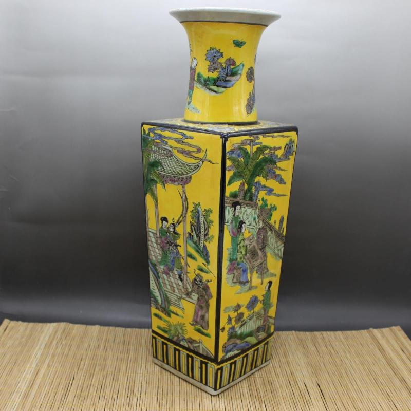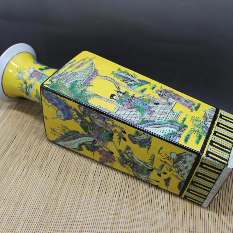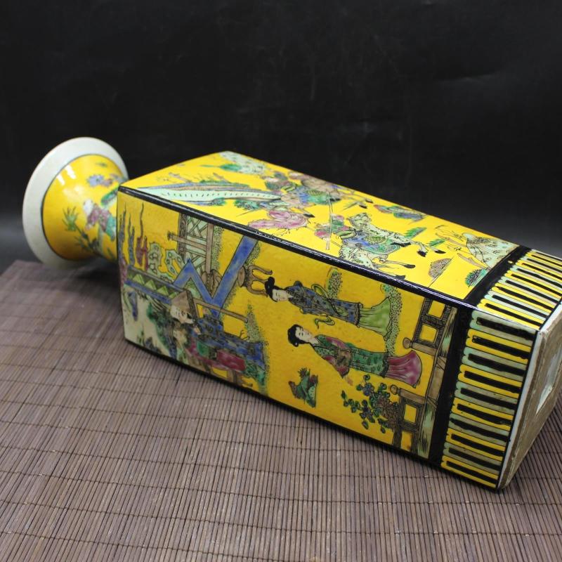 清康熙黃地粉彩人物故事天圓地方花瓶 老貨收藏仿古瓷器擺件古玩1入