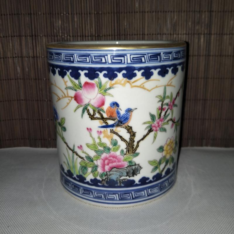 清乾隆青花斗彩描金粉彩花鳥筆筒 全手工仿古瓷器擺件古玩收藏1入