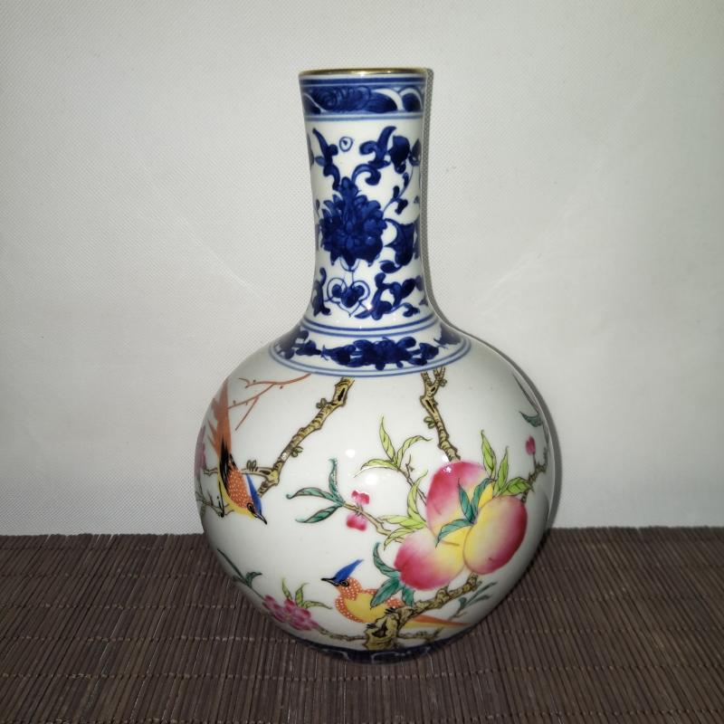 清乾隆青花斗彩花鳥壽桃天球瓶 全手工仿古瓷器擺件古董古玩收藏1入
