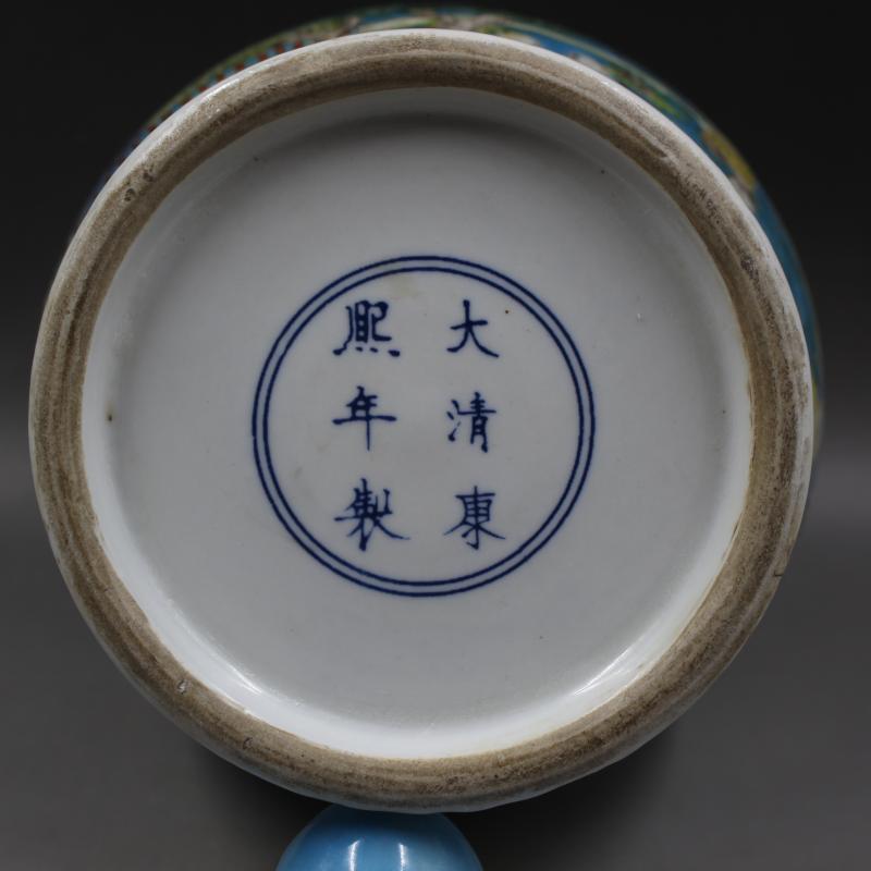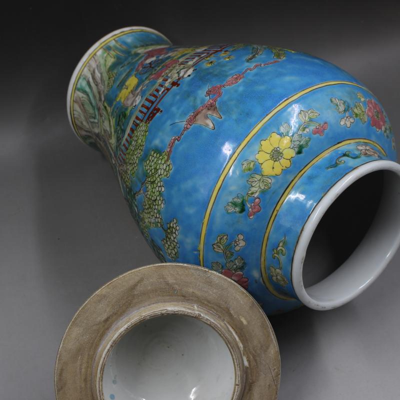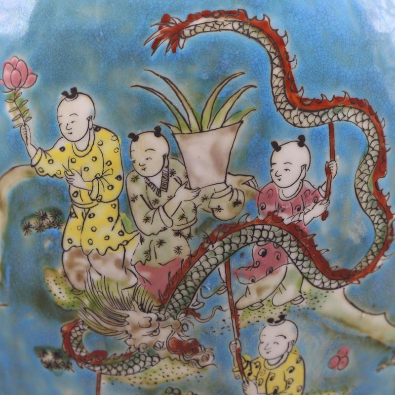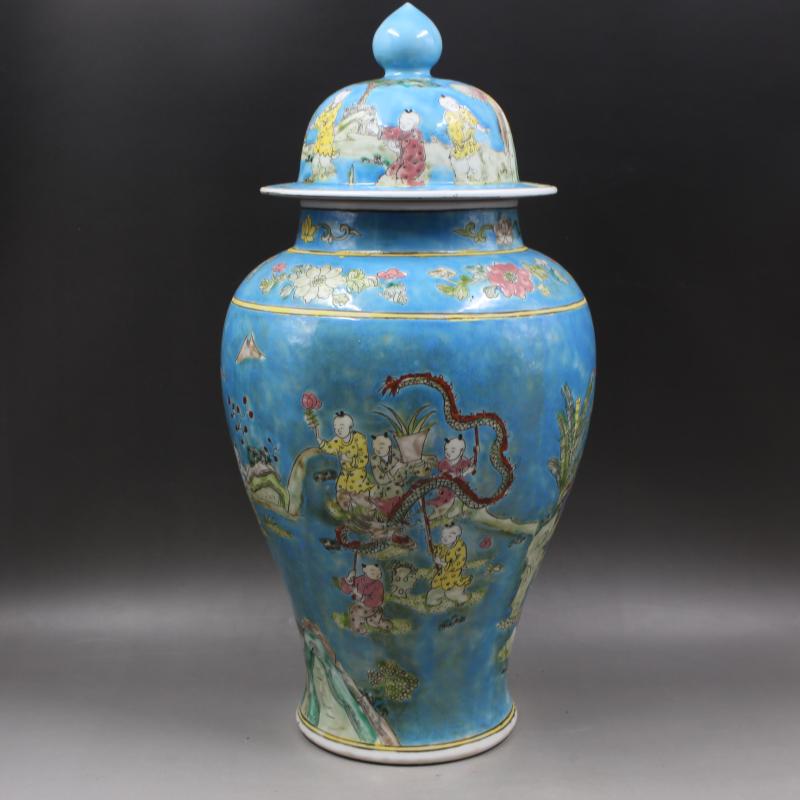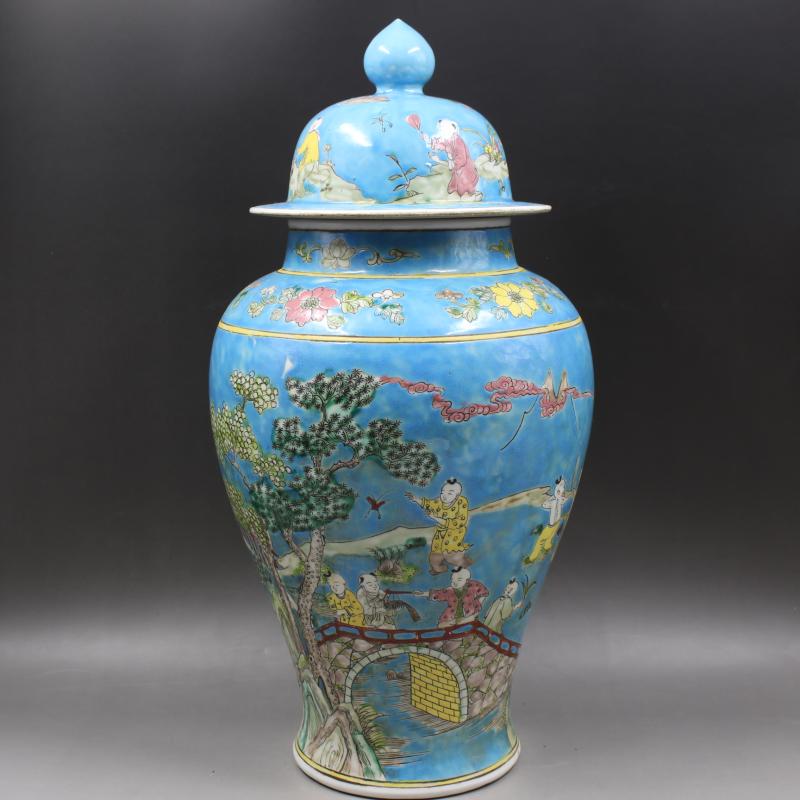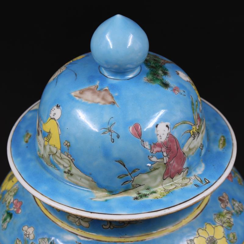 清康熙藍地粉彩兒童鬧元宵將軍罐仿古老貨瓷器擺件古董古玩收藏1入