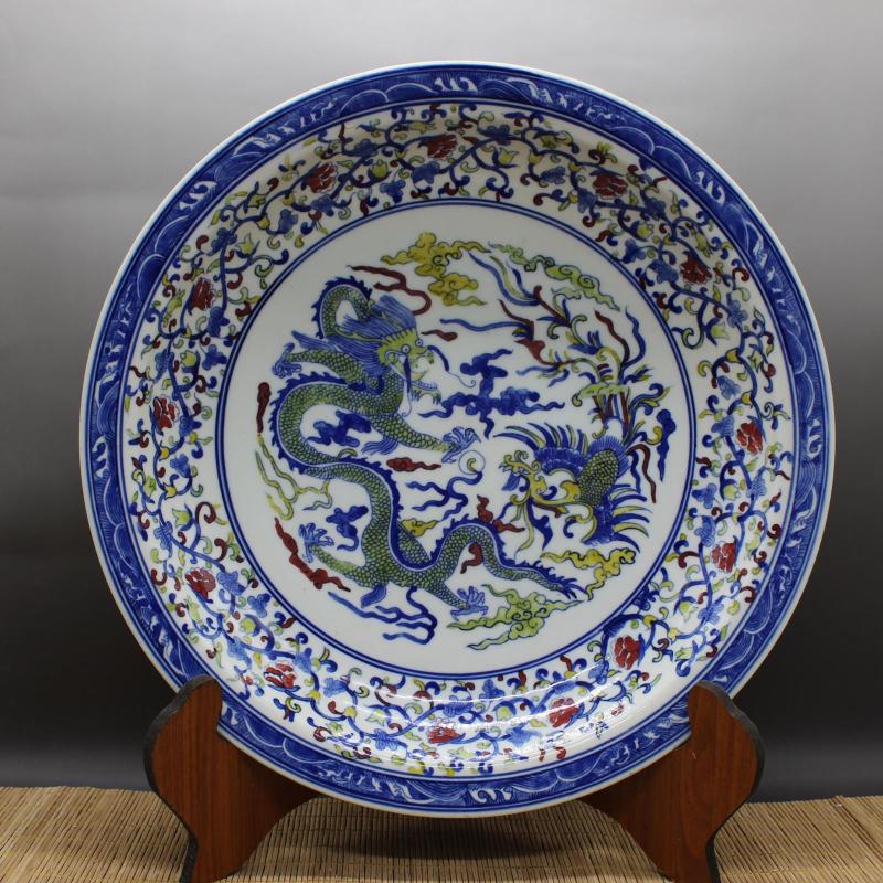 清康熙青花斗彩纏枝龍鳳紋大盤 全手工精品家居擺件瓷器 古玩收藏1入