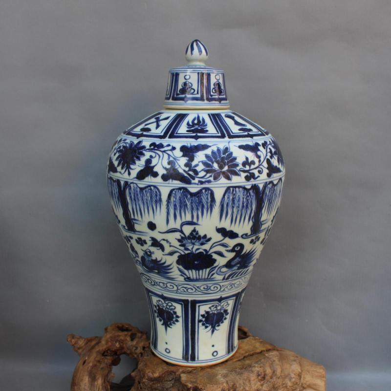元青花纏枝荷花鴛鴦梅瓶 手工手繪仿古出土老貨瓷器擺件 古董古玩1入