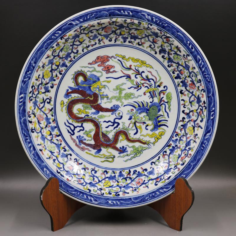 清乾隆青花斗彩龍鳳紋大盤手繪仿古老貨家居擺件瓷器收藏古董古玩1入