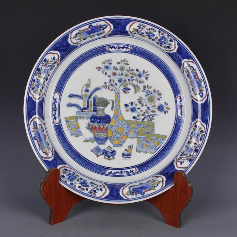 清乾隆青花斗彩博古花紋大盤手工景德鎮仿古老貨瓷器擺件古玩收藏1入
