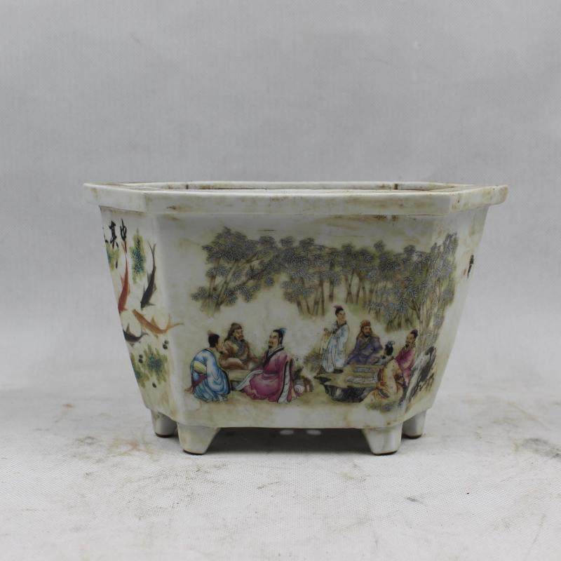 民國景德鎮粉彩人物六方花盆 家居擺件仿古瓷器盆景 古董古玩收藏1入
