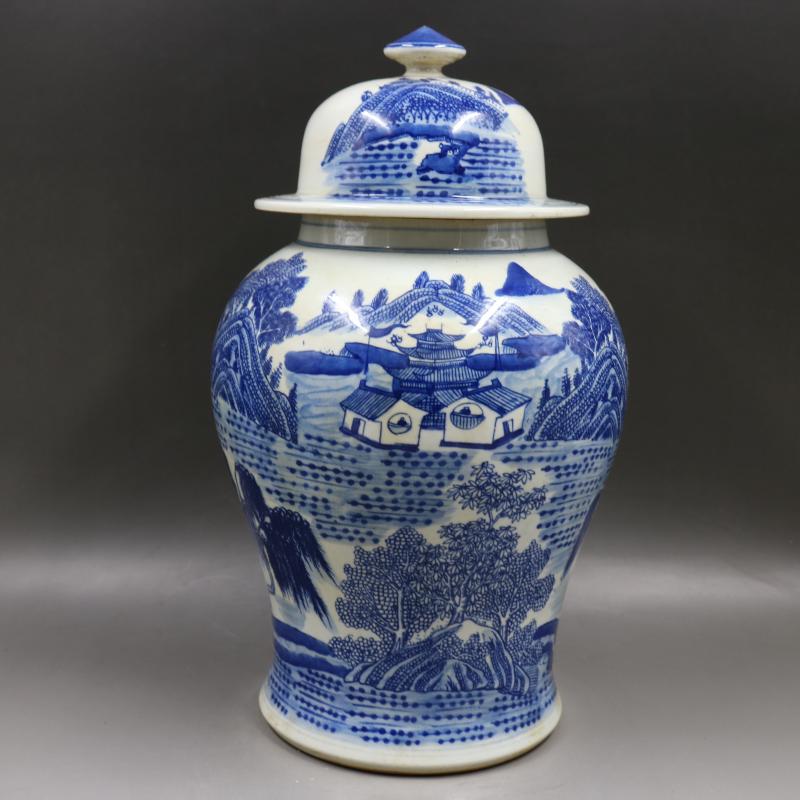 清康熙青花山水人家將軍蓋罐全手工老貨仿古瓷器古董古玩擺件收藏1入