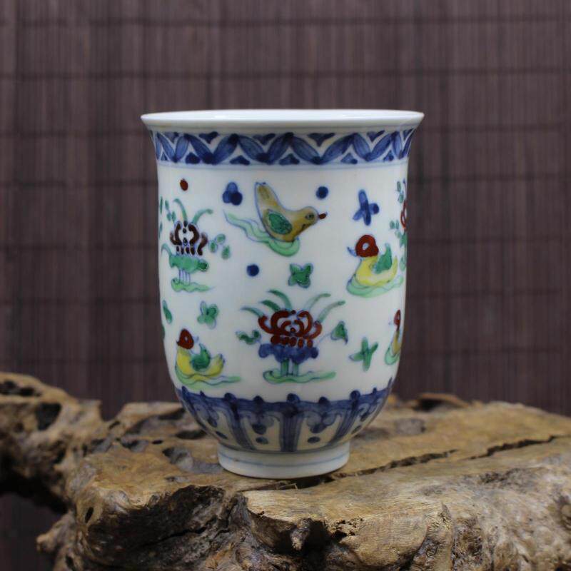明成化青花斗彩荷花鴛鴦紋大號茶杯 精品茶具擺件 古瓷器收藏古玩1入