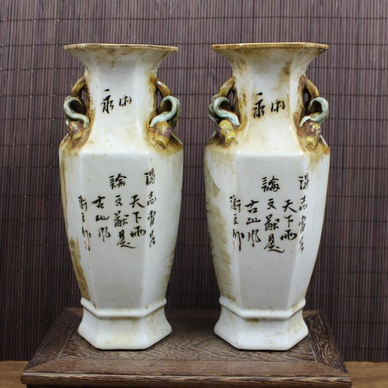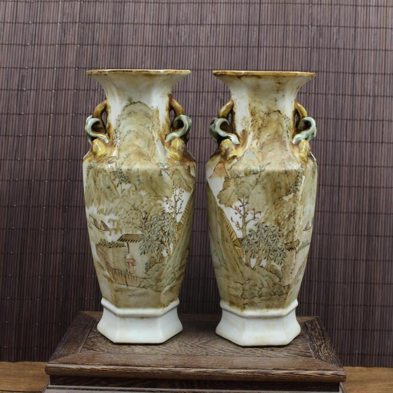 清同治淺降彩山水人家六方花瓶 全手工老貨收藏瓷器擺件 古董古玩1入