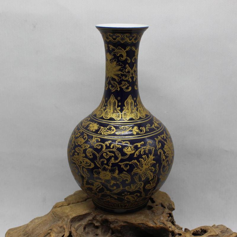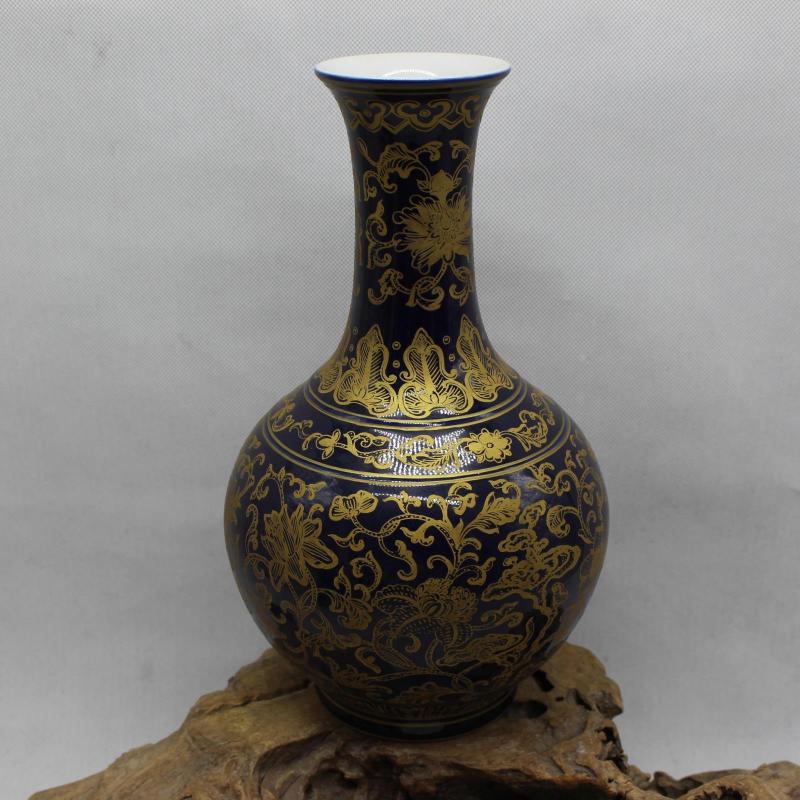 清乾隆年制祭藍描金纏枝花紋賞瓶 家居擺件仿古瓷器 古董古玩收藏1入