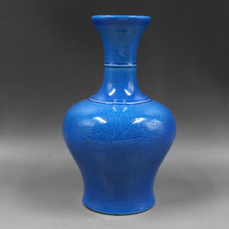 大明弘治年制刻花孔雀藍釉搖鈴尊瓶手工仿古瓷器家居擺件古董古玩1入