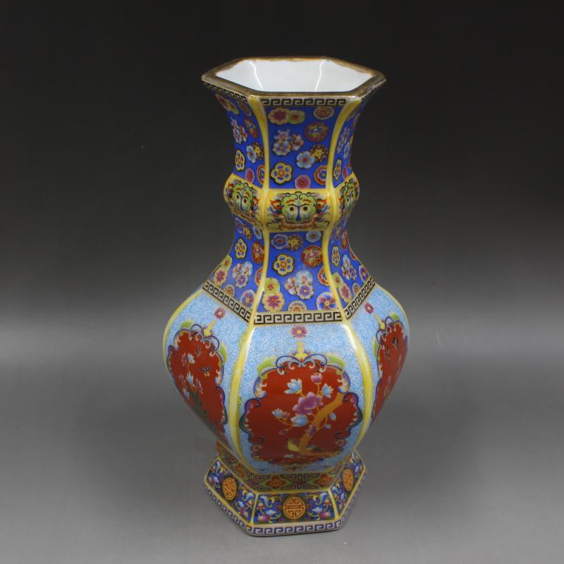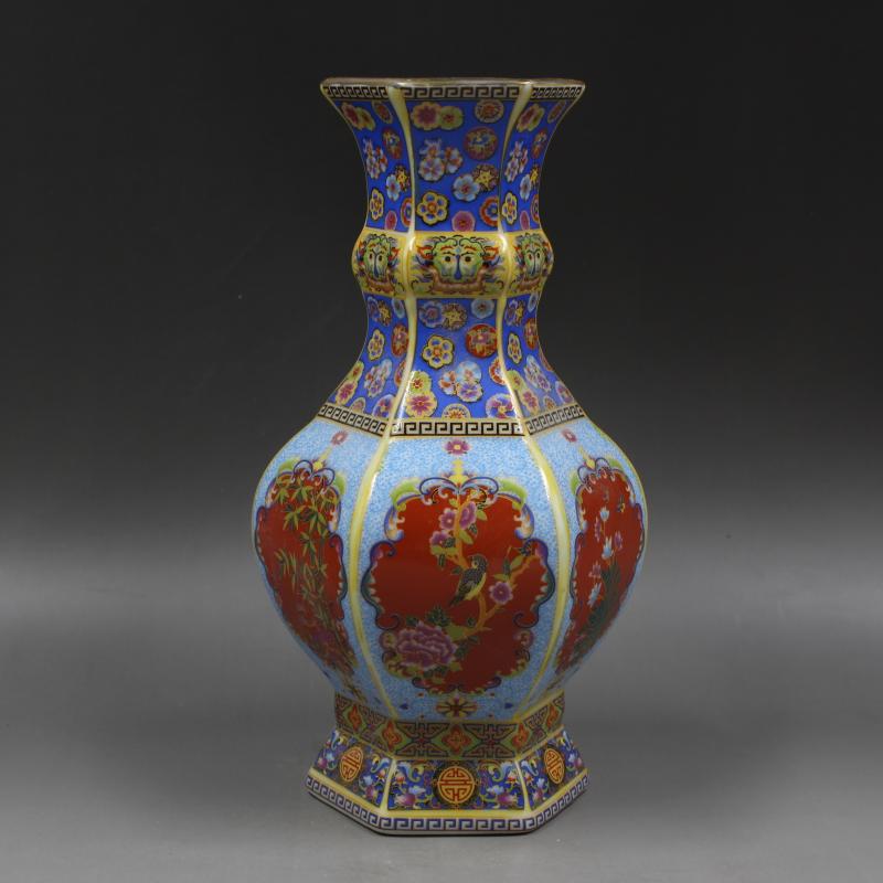 清雍正琺瑯彩描金花鳥六方花瓶 家居擺件仿古瓷器收藏 古董古玩1入