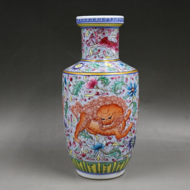 清乾隆年制粉彩描金獅紋棒槌瓶家居裝飾擺件仿古瓷器古董古玩收藏1入