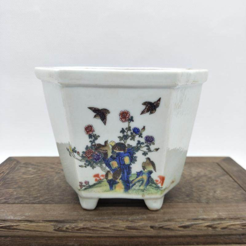 民國粉彩花鳥方形花盆 古董老陶瓷舊貨古玩瓷器老貨擺件收藏1入
