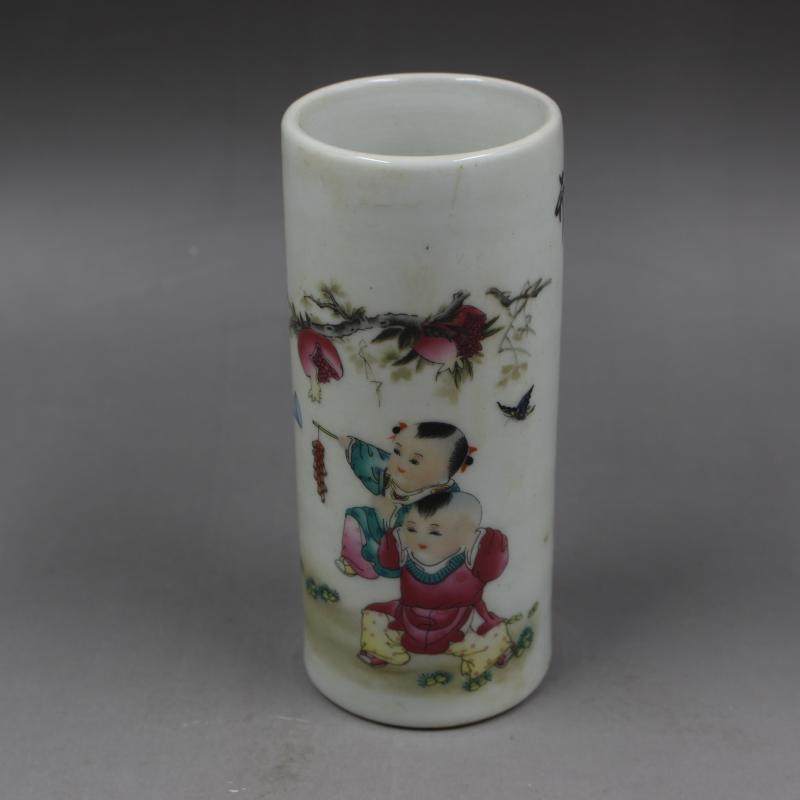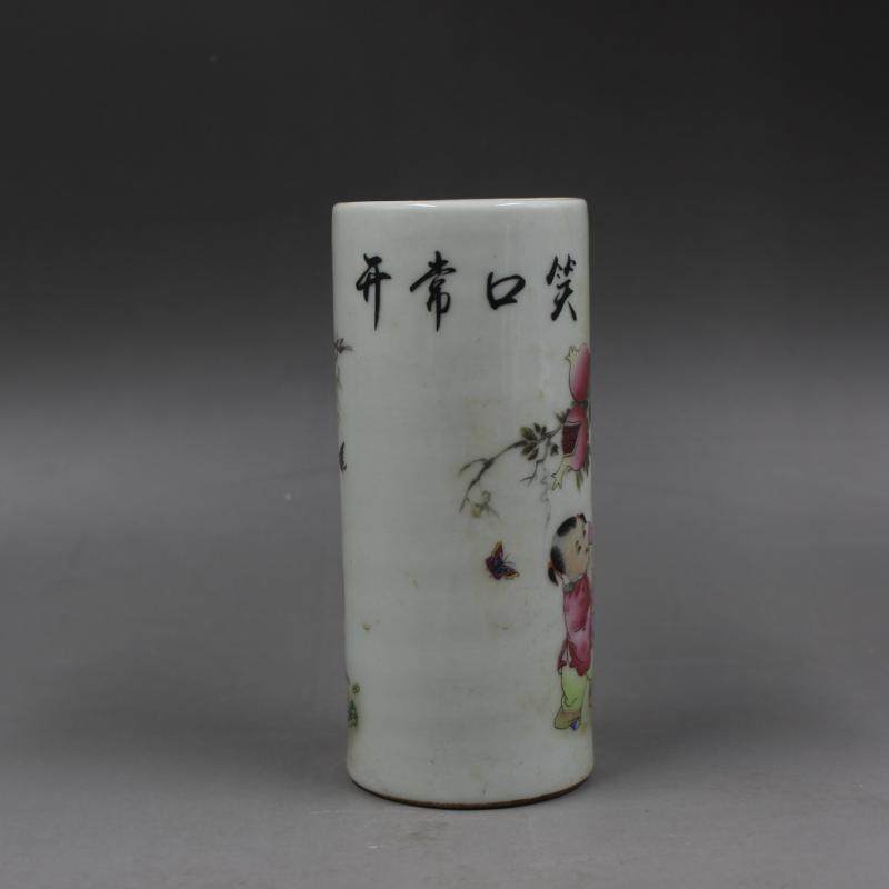 民國粉彩笑口常開人物筆筒文房書桌仿古瓷器擺件古董古玩老貨收藏1入