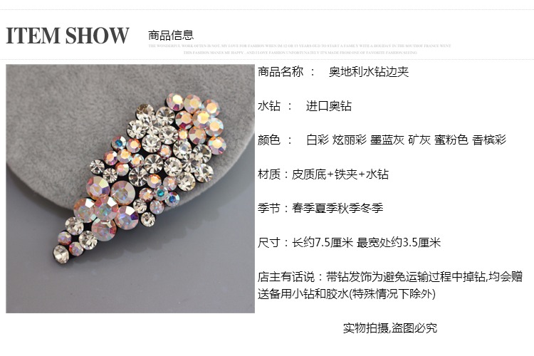 韓式滿鉆皮邊夾韓國正品奧地利水鉆劉海夾BB夾高檔女式小發夾發卡1入