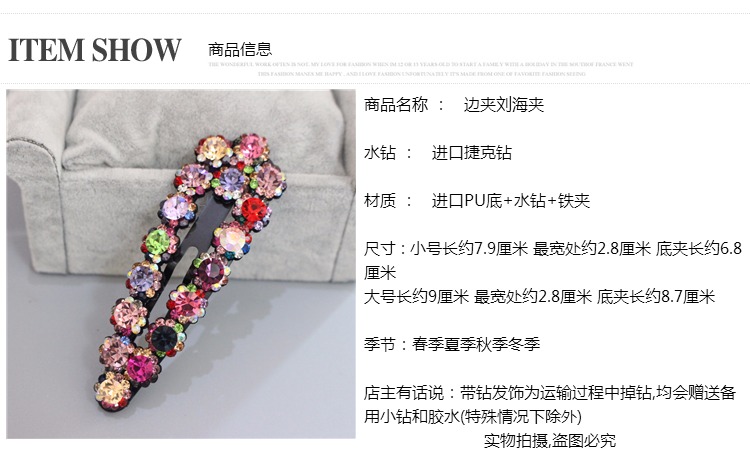 韓國鑲鉆邊夾 韓版水晶BB夾皮質夾劉海夾小號大號發夾碎頭發飾品1入