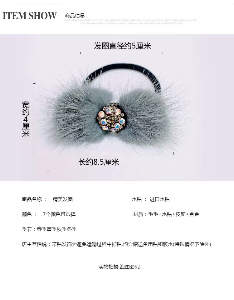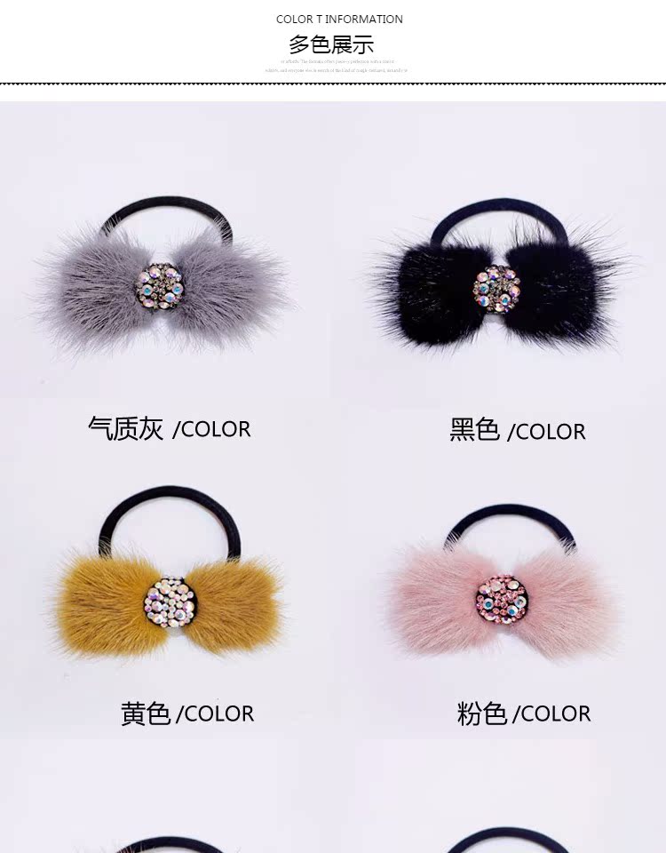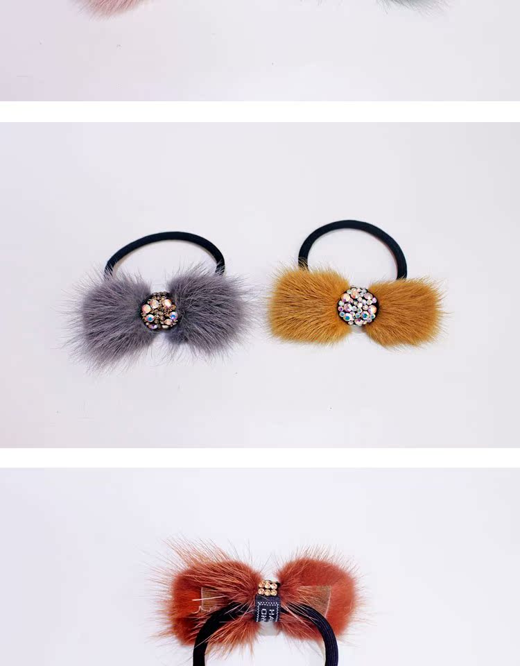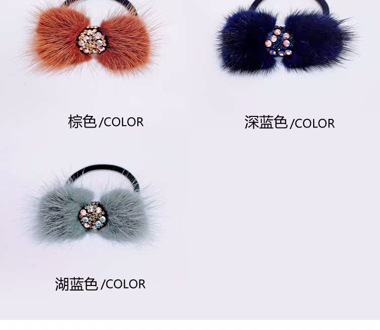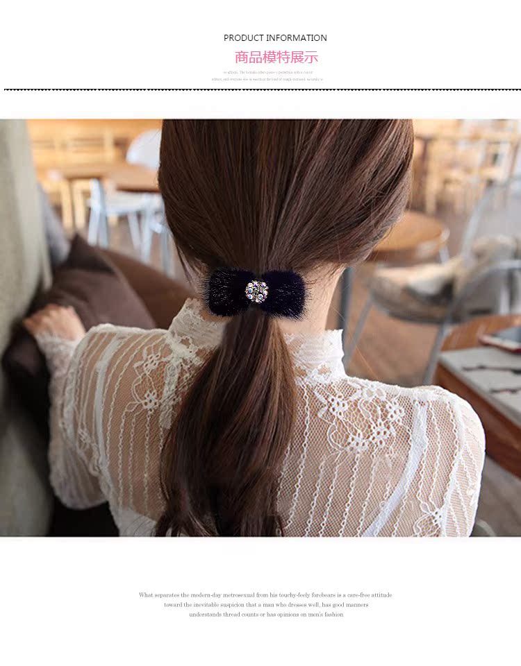 頭繩韓國水貂毛蝴蝶結發圈鑲鉆皮筋毛毛馬尾發繩頭飾飾品簡約發飾1入