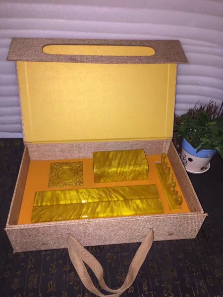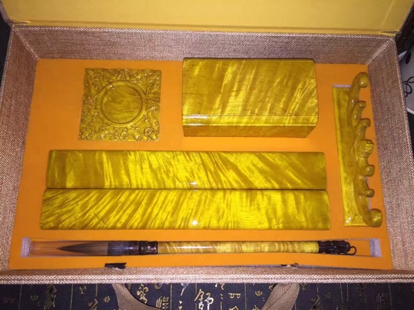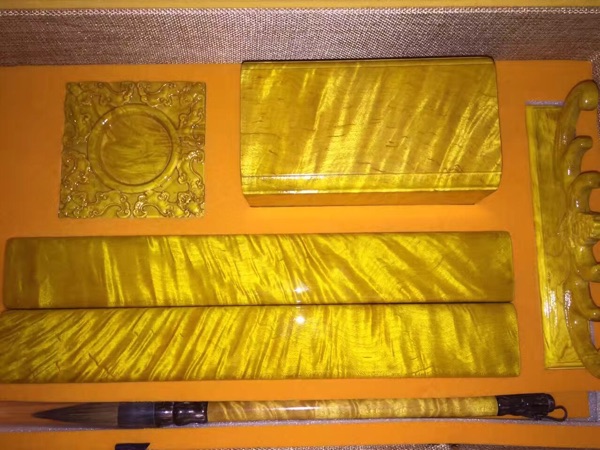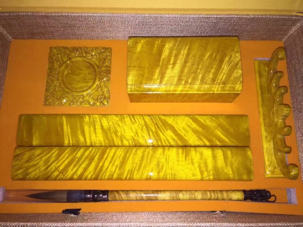 金絲楠木大葉楠文房四寶五件套含鎮尺毛筆筆筒筆架硯臺禮盒裝1入