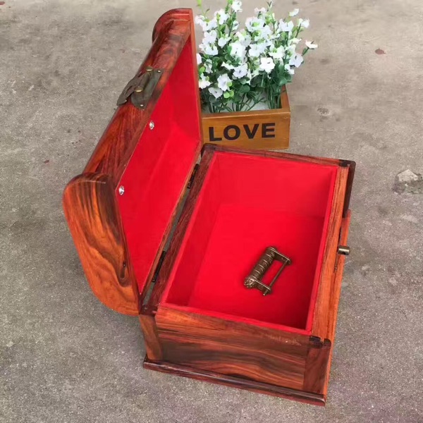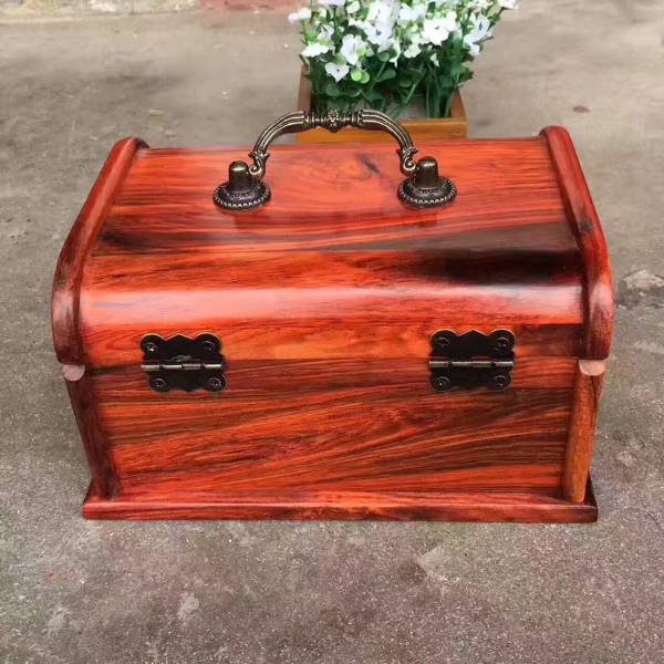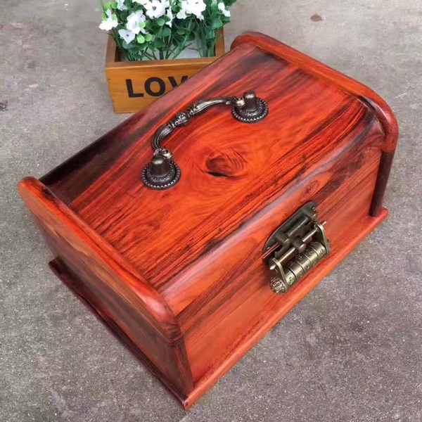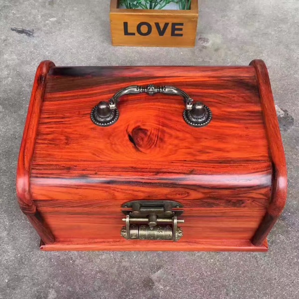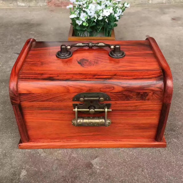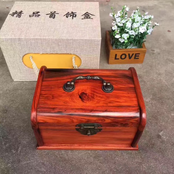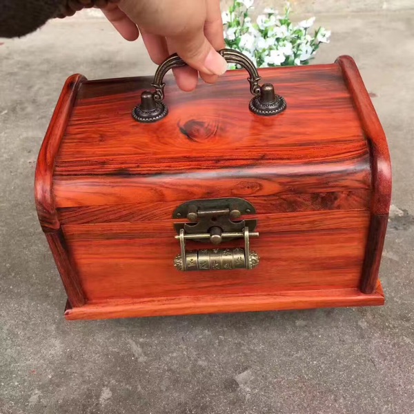 子孫大吉春開【品名】復古手提首飾盒【材質】大紅酸枝【規格】20×14.5×10.5紅酸枝獨板,都是紅彤彤的,配復古(子孫大吉春)鎖。手提款,內部貼絨,