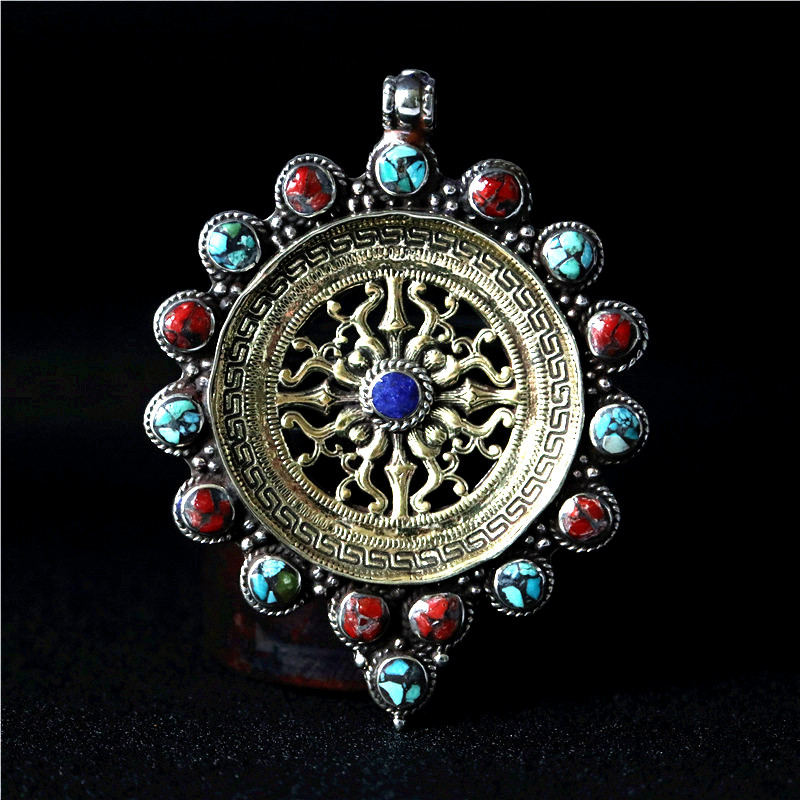 西藏純手工鑲嵌天然綠松石刪胡吊墜掛件尼泊爾民族風藏銀黃銅吊墜1入