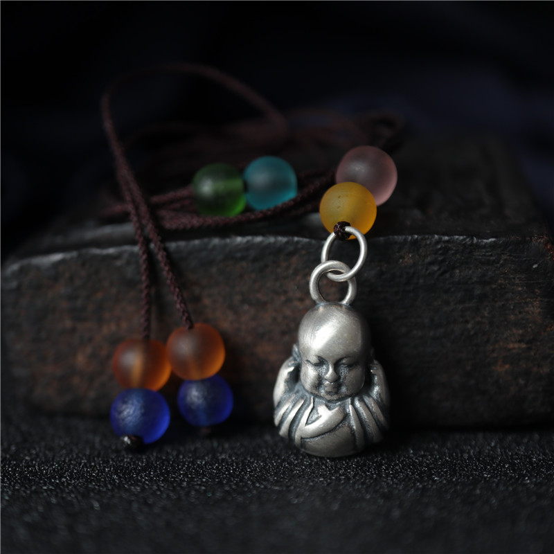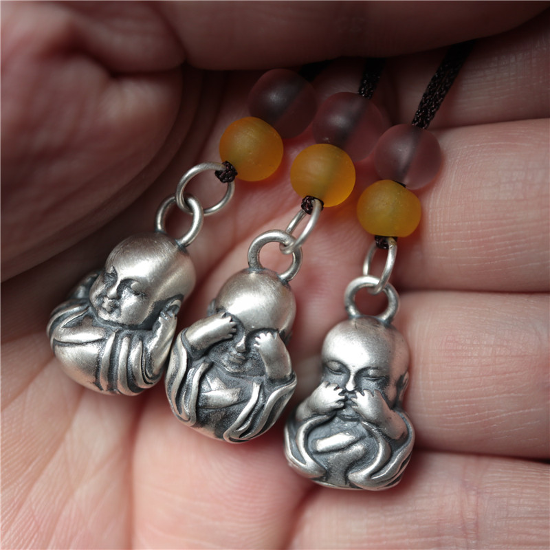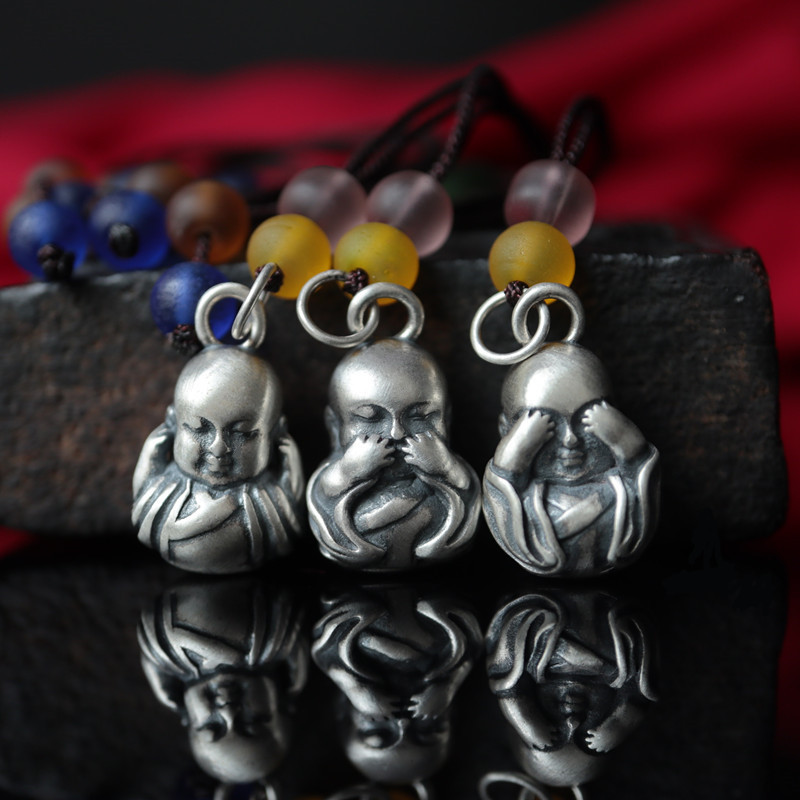 西藏純銀S925不聽不看不說小沙彌和尚吊掛墜配飾手鏈帶環DIY配件1入