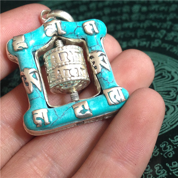 鑲嵌松石帶六字真言轉經筒吊墜1入