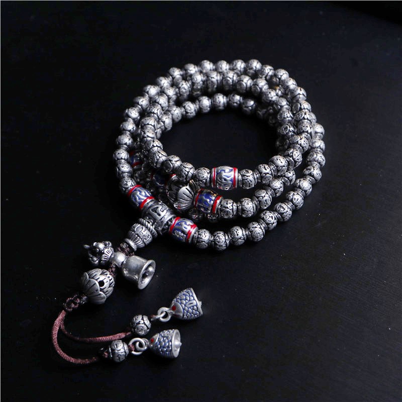 規格描述:珠子直徑5.8mm108顆,藏銀白銅三七銀,永不掉色,珠子硬度好,耐磨損