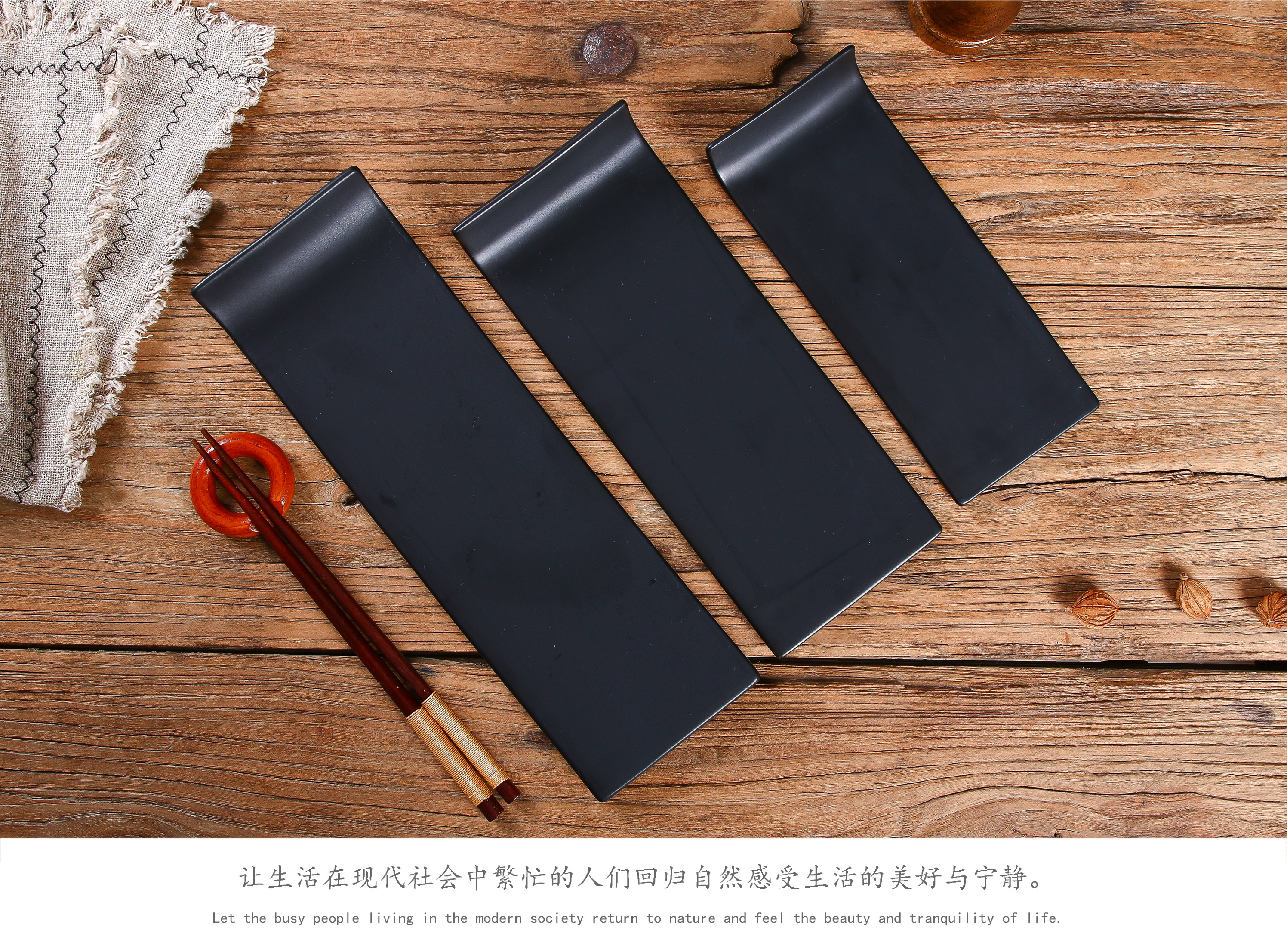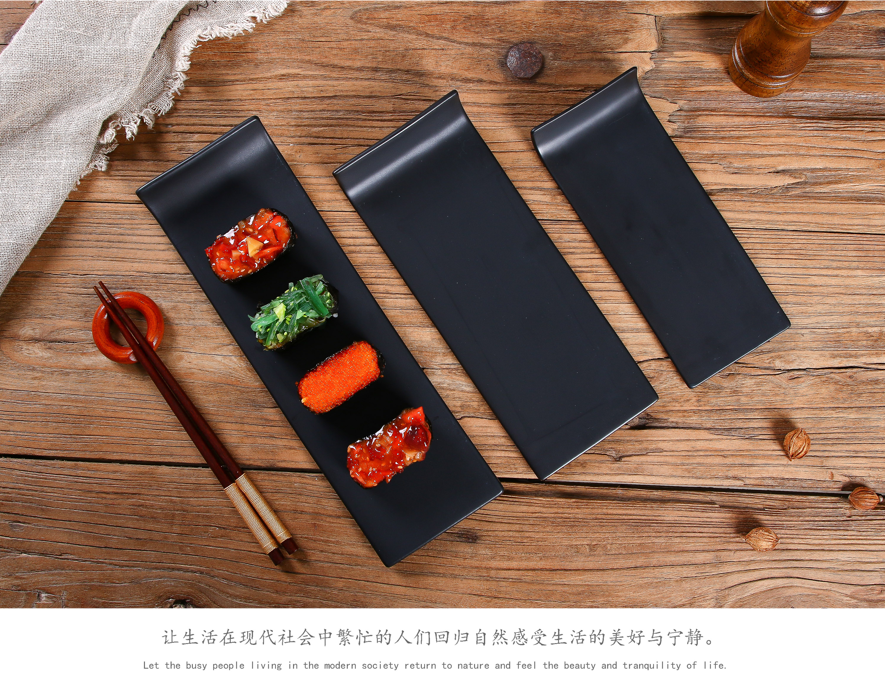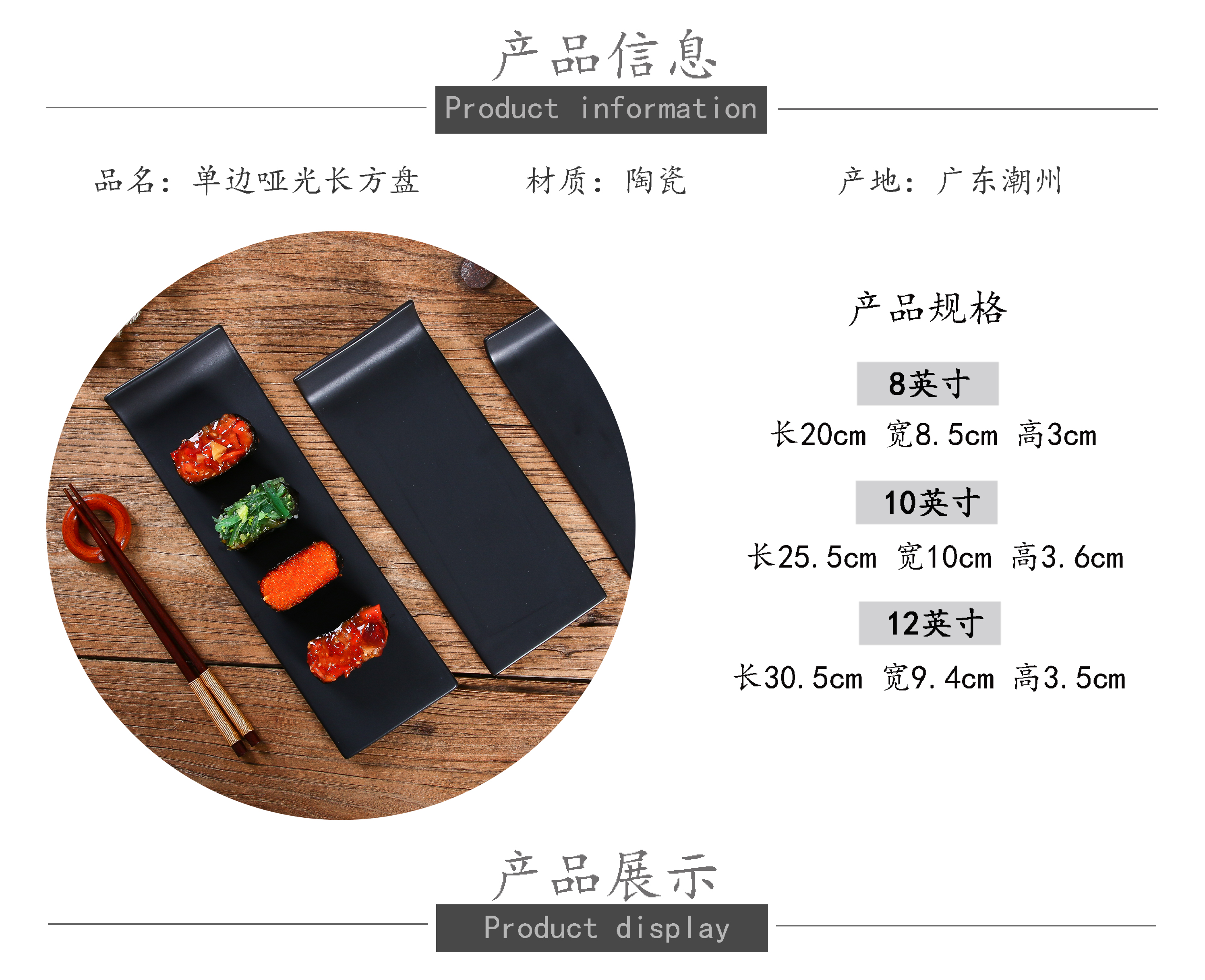 陶瓷黑色啞光平板盤日式壽司盤刺身盤蛋糕盤擺臺托盤長條冷菜盤子1入