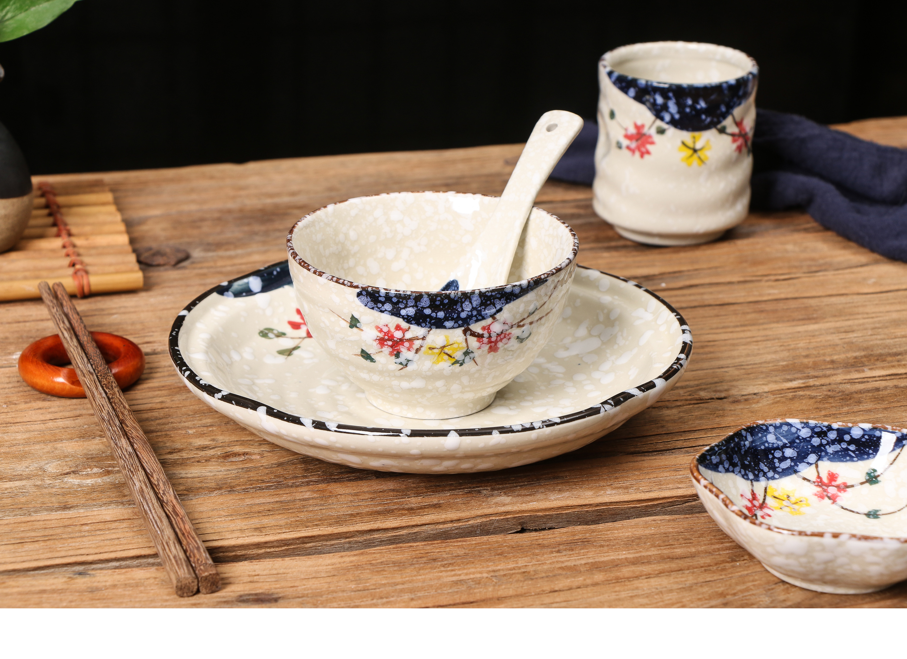 一人食餐具陶瓷和風盤勺子味碟杯子菜盤飯碗商用擺臺餐具套裝家用1入