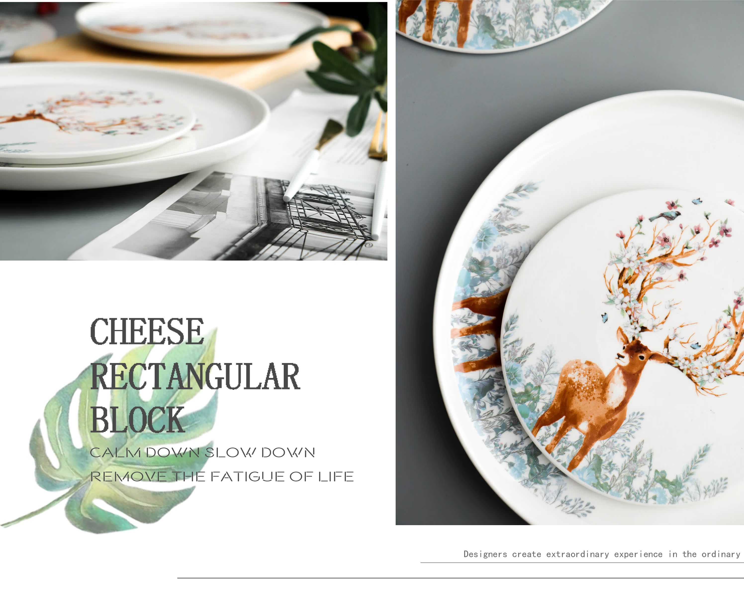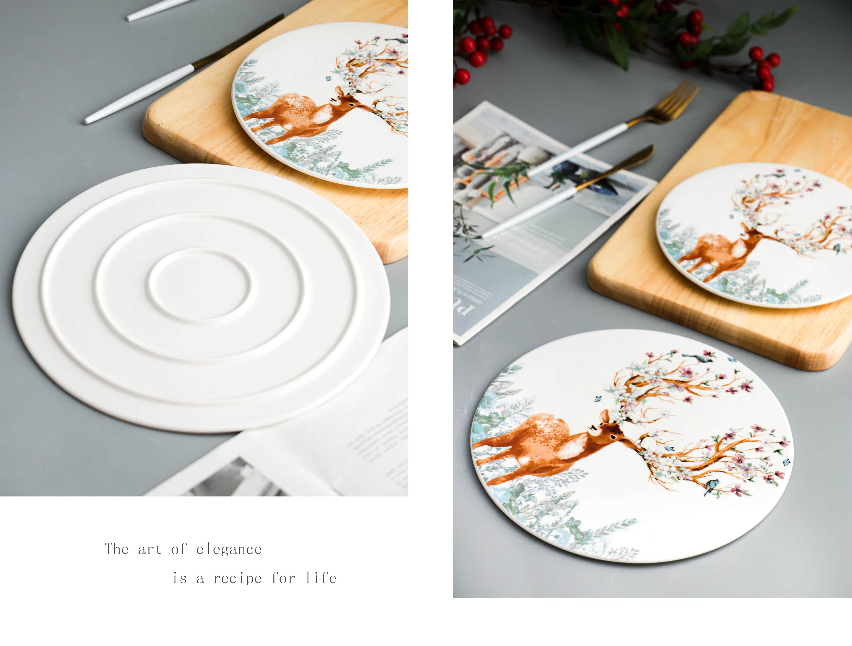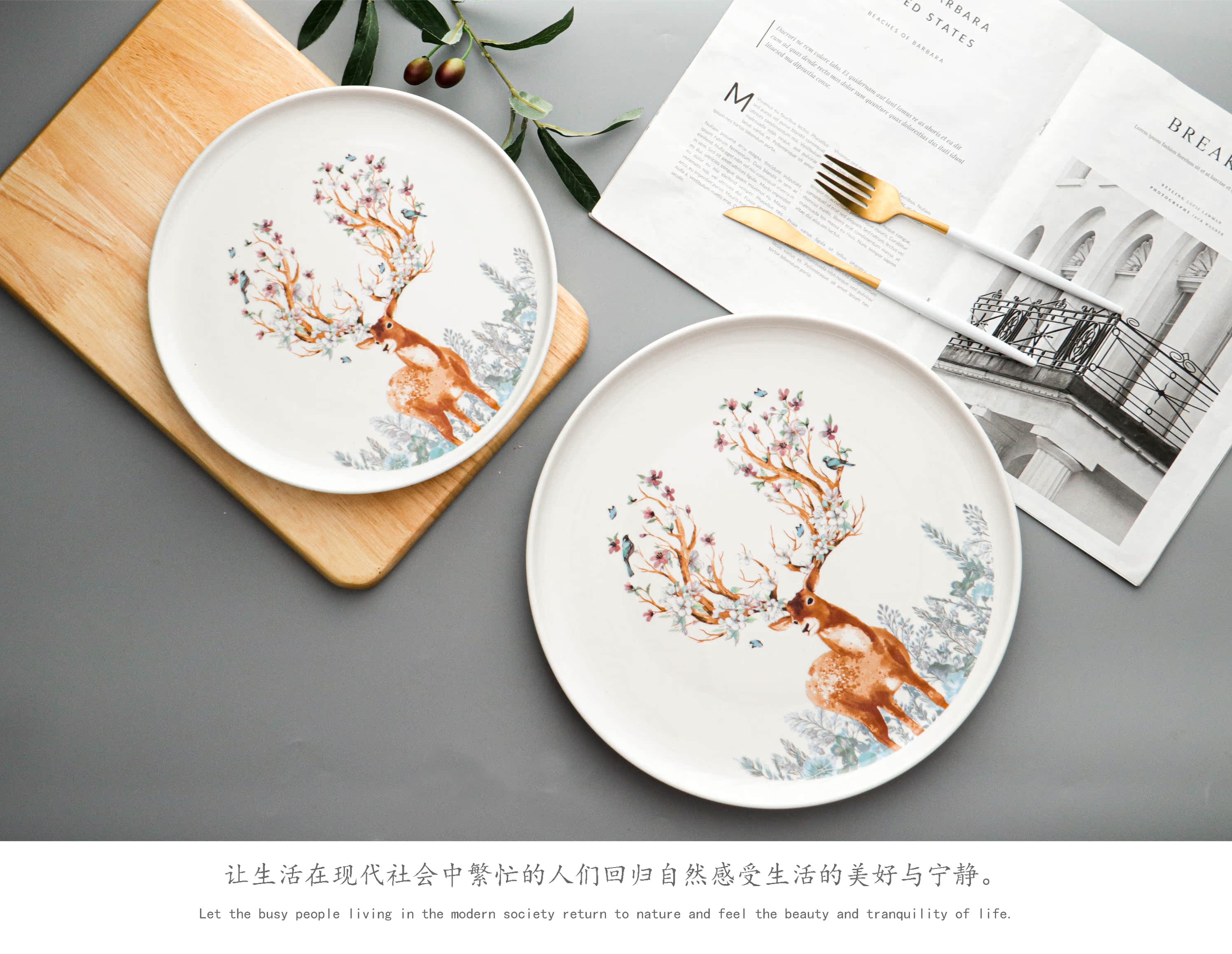 ins陶瓷花鹿圓盤裝飾淺盤平板盤水果沙拉盤披薩盤意面盤餐廳擺臺1入