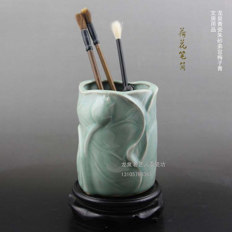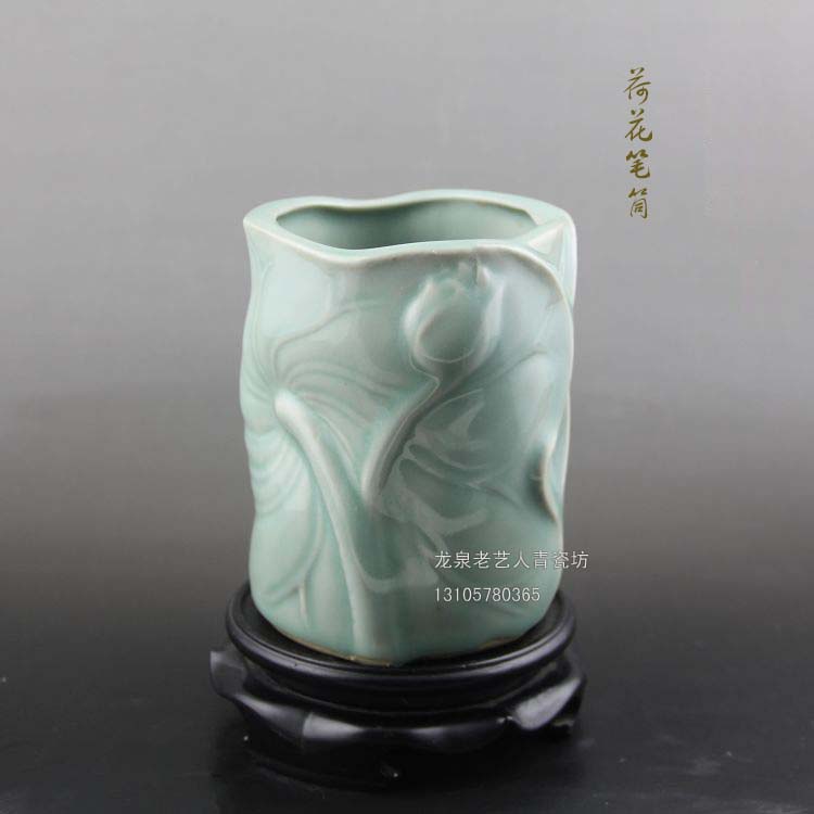 【詳細說明】:此款荷花筆筒是80年代龍泉瓷器總廠(上垟瓷廠)老器型, 是老一輩瓷器制作人以池塘蓮花荷葉為題材精心設計,比例恰到好處,美觀大方實用。書房擺件,有著濃郁的書畫文化氣氛。