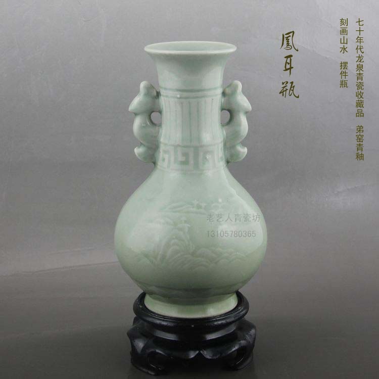 【詳細說明】:此瓶是80年代龍泉瓷器總廠(上垟瓷廠)燒制的產品,器型屬于老一輩瓷器制作人以山水、鳳耳為題材精心設計,瓶身刻畫山水紋路,釉面深淺恰到好處。釉色剔透,古樸而透,圖案清晰,清楚顯現山水氣勢,器型美觀。本品在當年選瓷標準優質產品的基礎上再做了挑選。