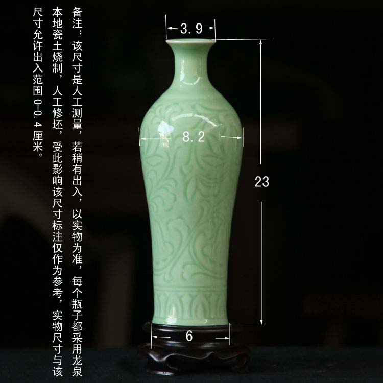 【包裝】:普通紙箱與泡沫厚實包裝(需要錦盒的買家可以點擊“錦盒”購買) 【用途】:書房、客廳、博古架等高檔擺設 【詳細說明】:此瓶器型為傳統觀音瓶,其身上紋路半刀紋刻畫牡丹花紋,釉水覆蓋經過高溫控制。施弟窯梅子青釉,形成翠玉可人的釉面。新穎而不失古樸。采用龍泉最高山 峰土質(高嶺土)作為生產原料,傳統的原料加工和產品成型技藝;經高溫1300℃燒制而成。因 此本廠產品受到各界瓷器愛好者的關注。