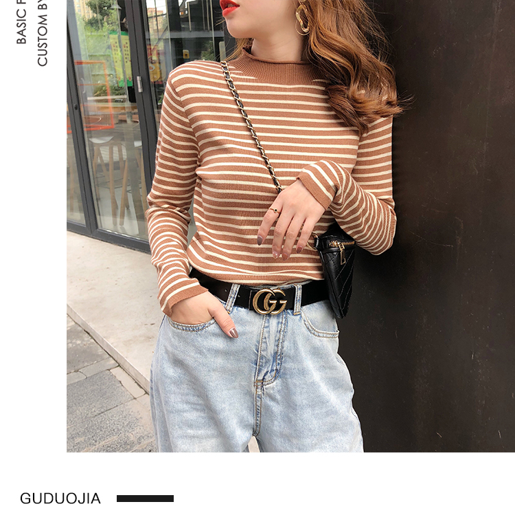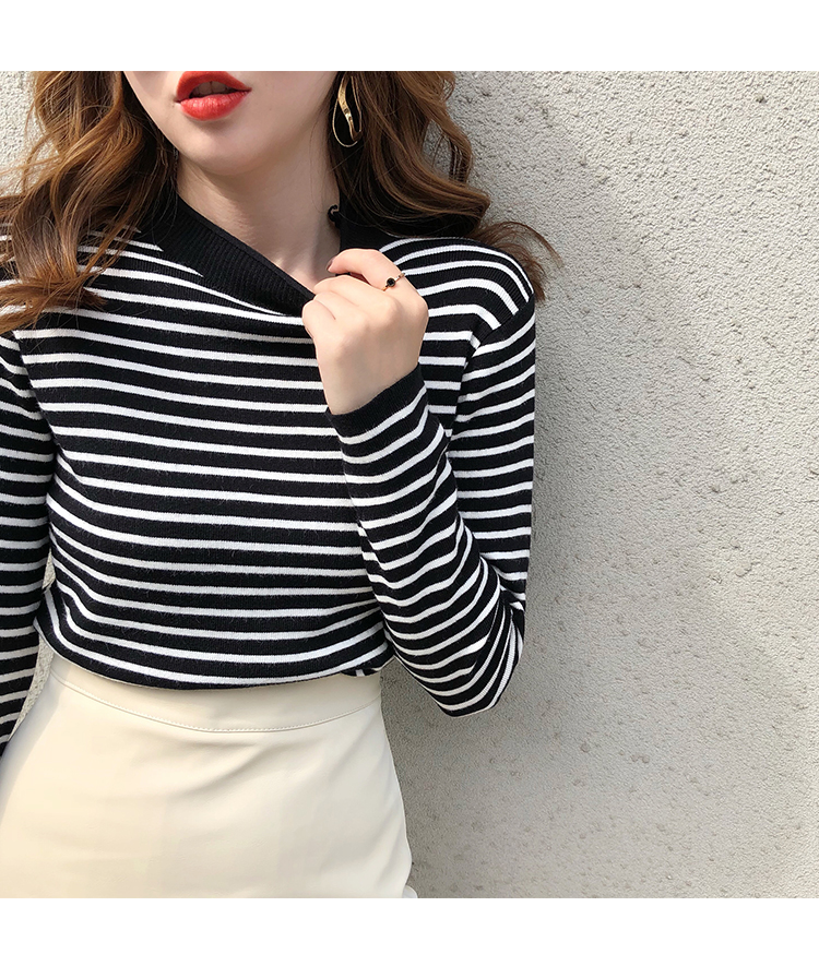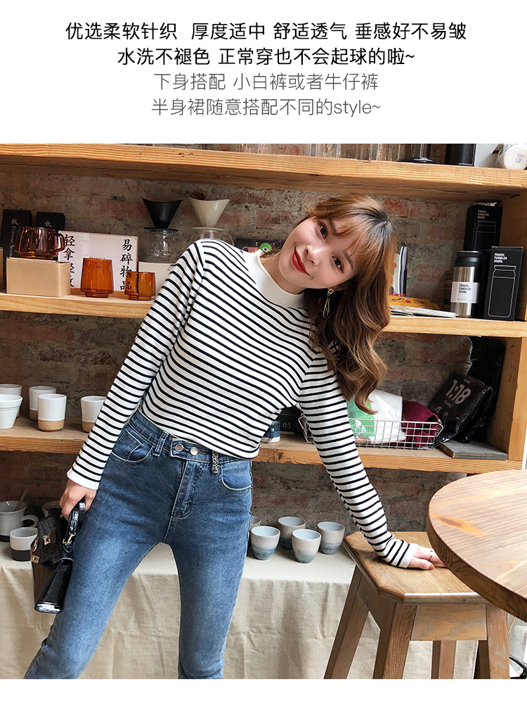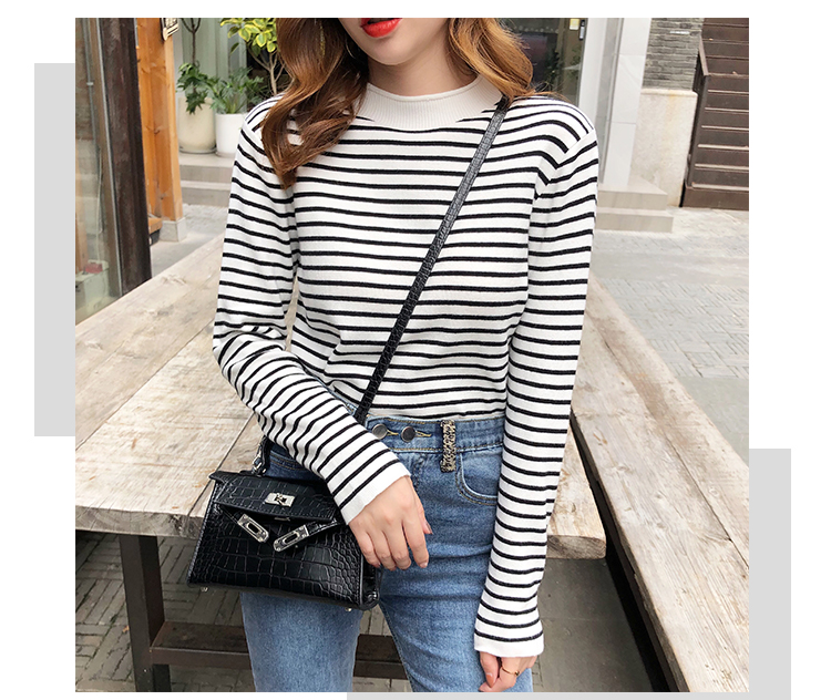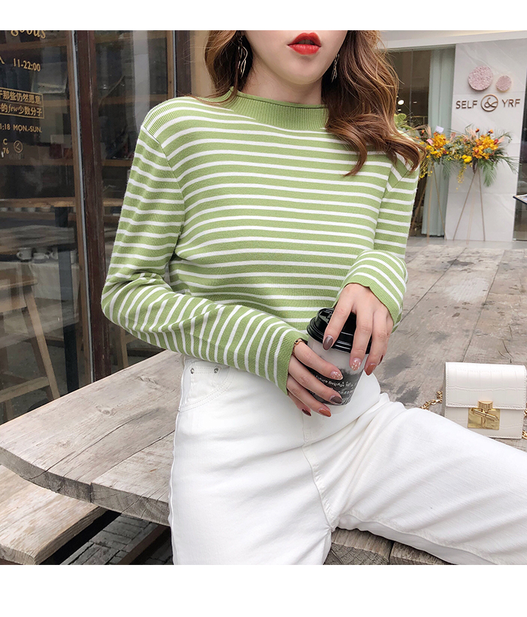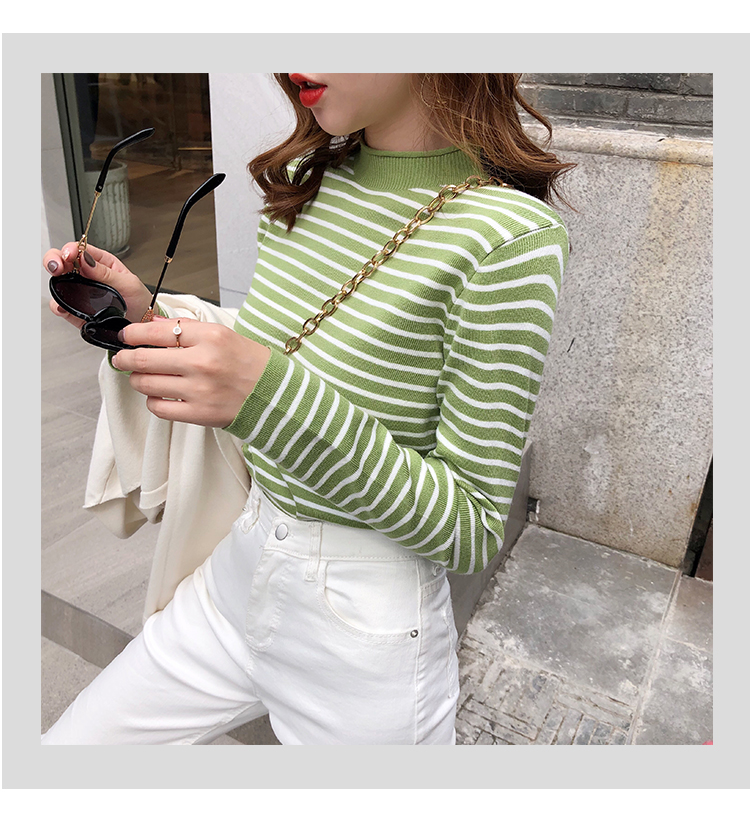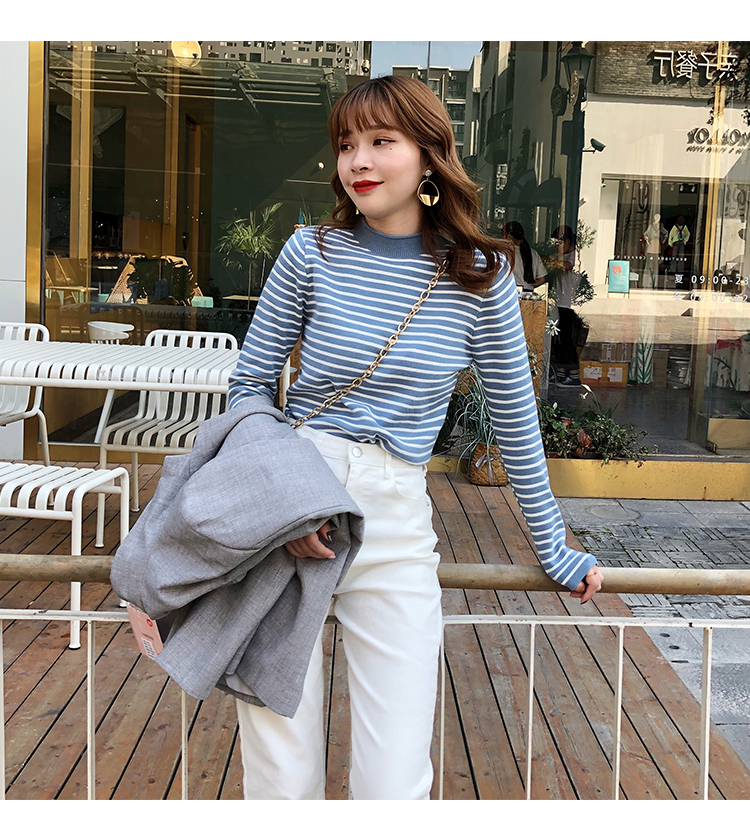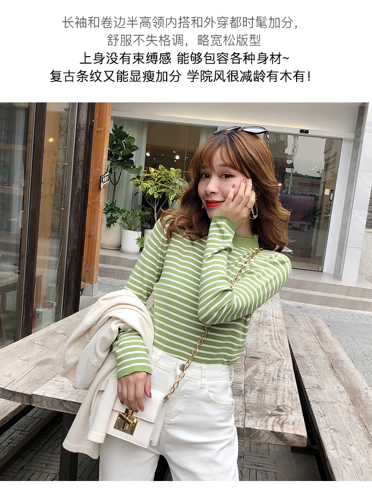 2019秋季新款半高領條紋針織衫女寬松套頭毛衣百搭韓版打底衫上衣1入