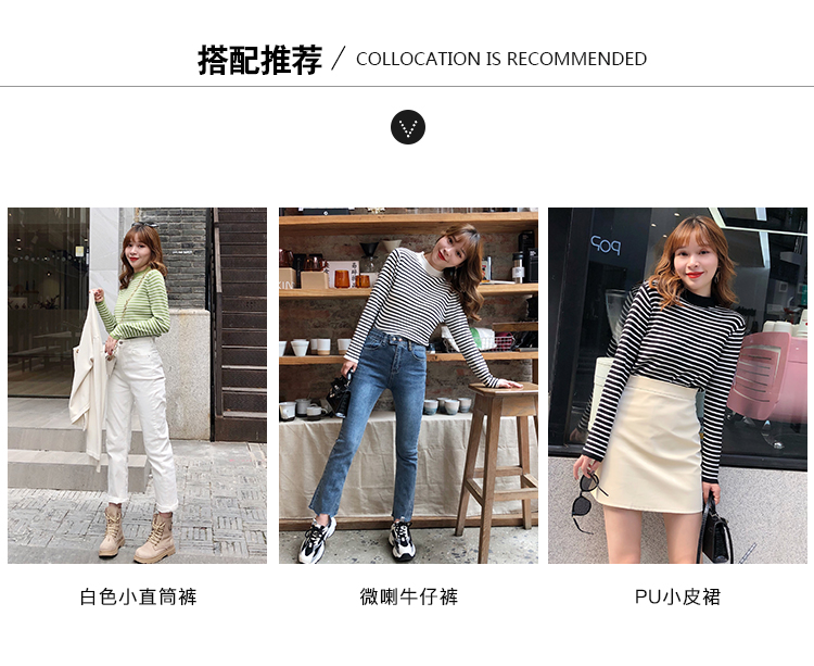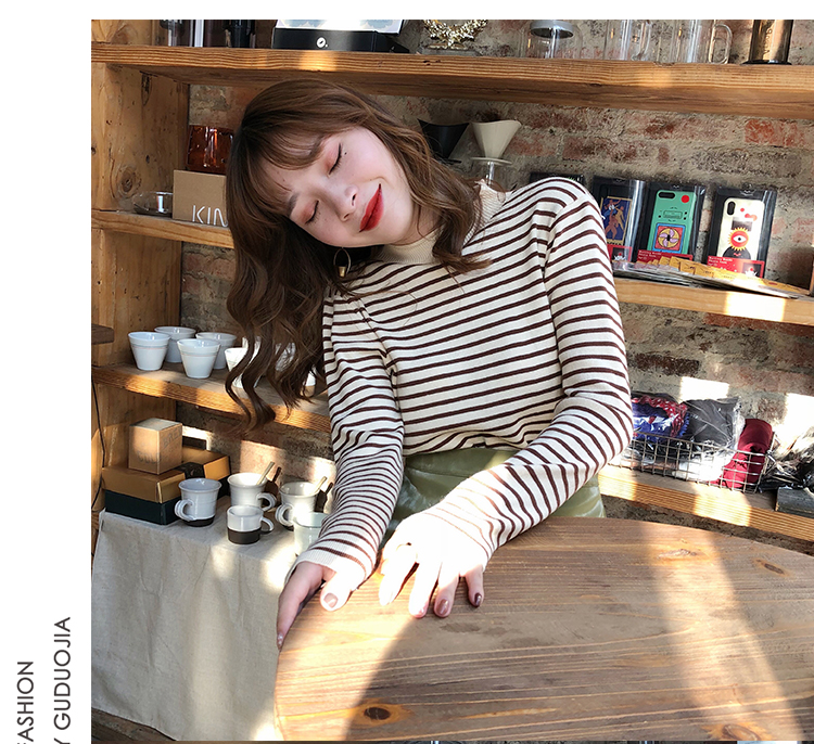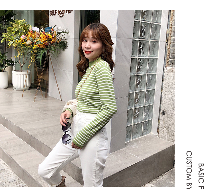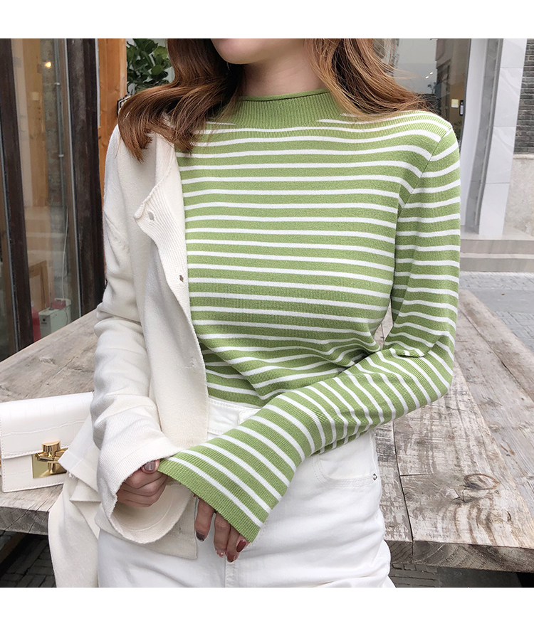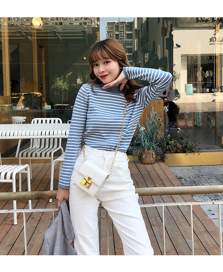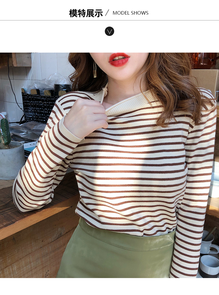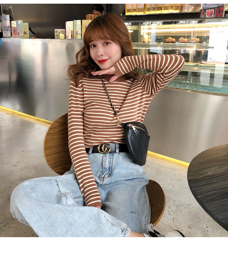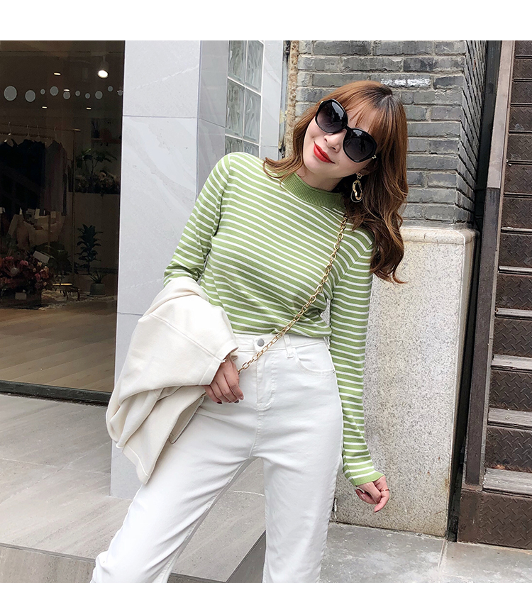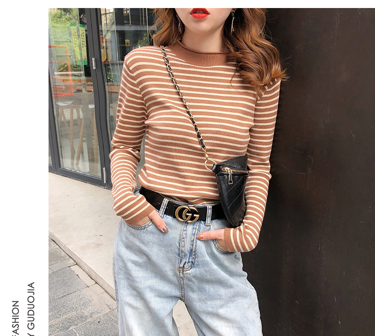 2019秋季新款半高領條紋針織衫女寬松套頭毛衣百搭韓版打底衫上衣1入