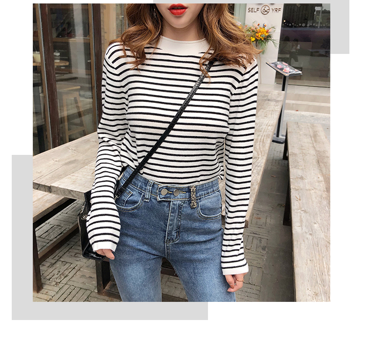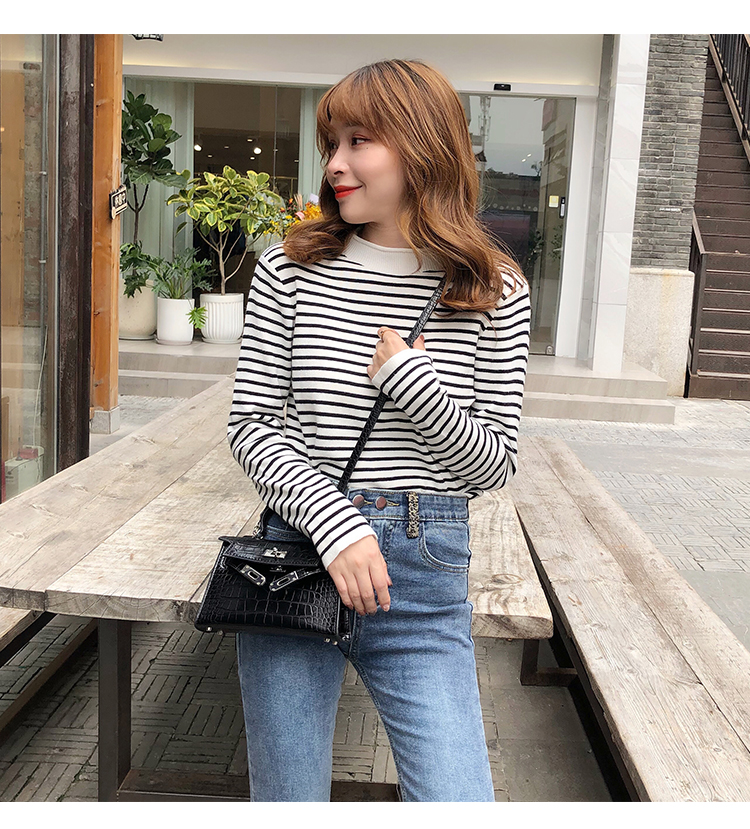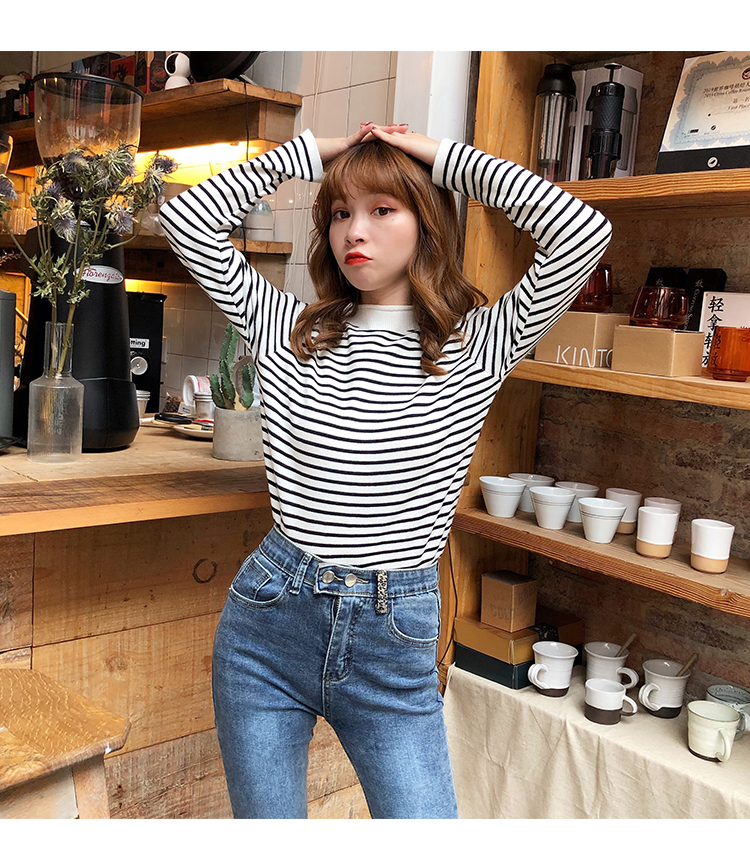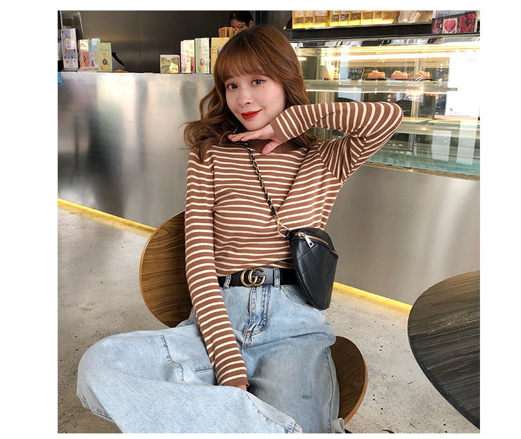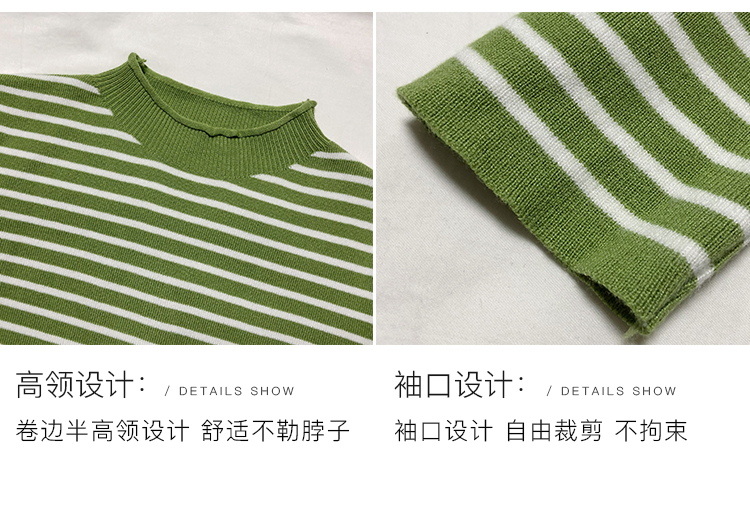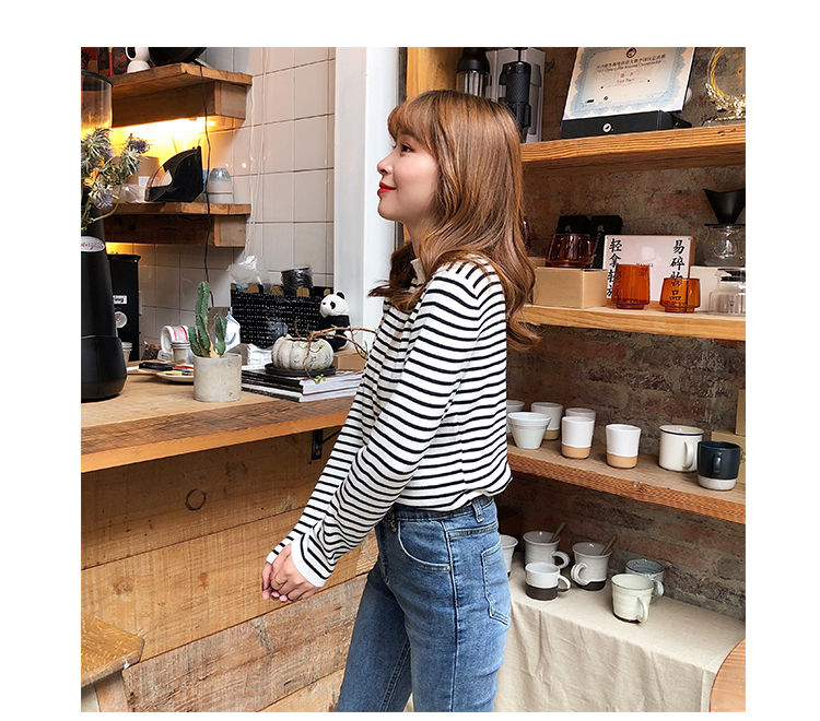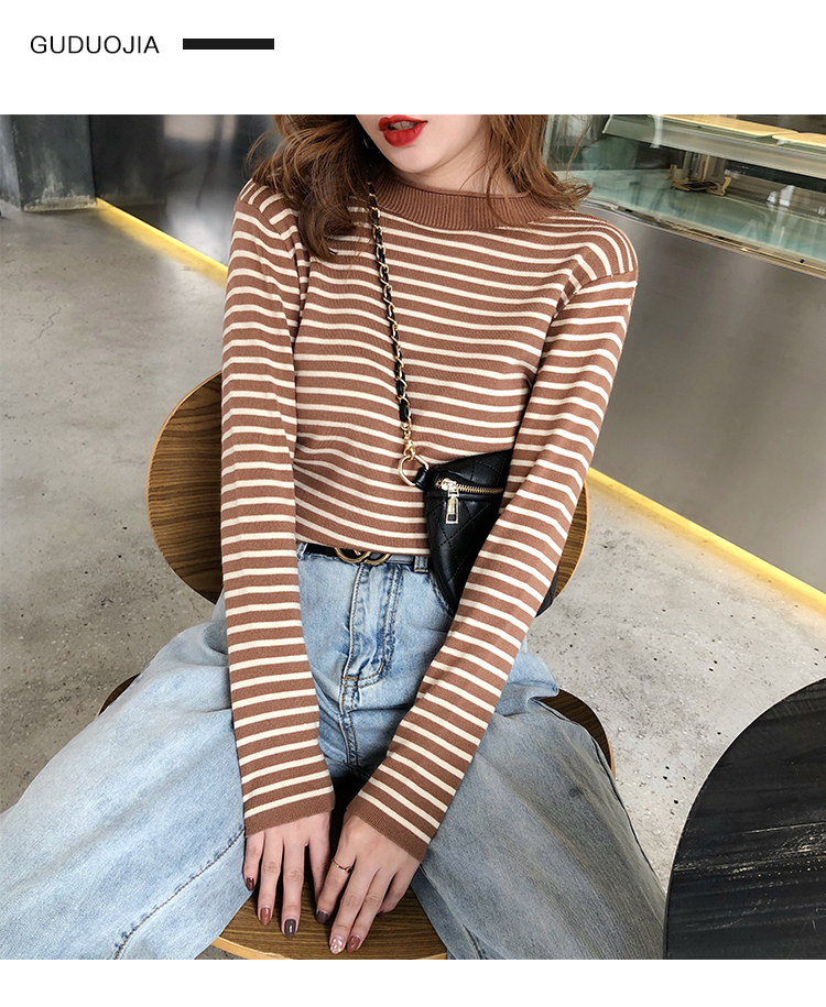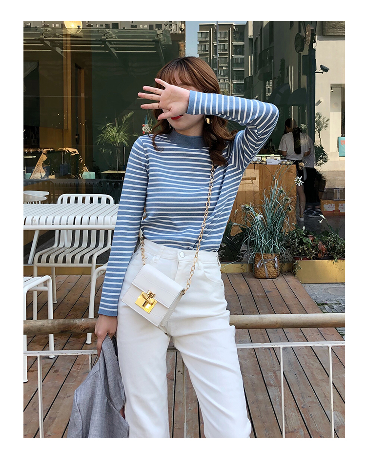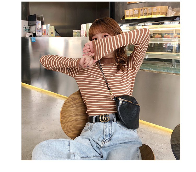 2019秋季新款半高領條紋針織衫女寬松套頭毛衣百搭韓版打底衫上衣1入