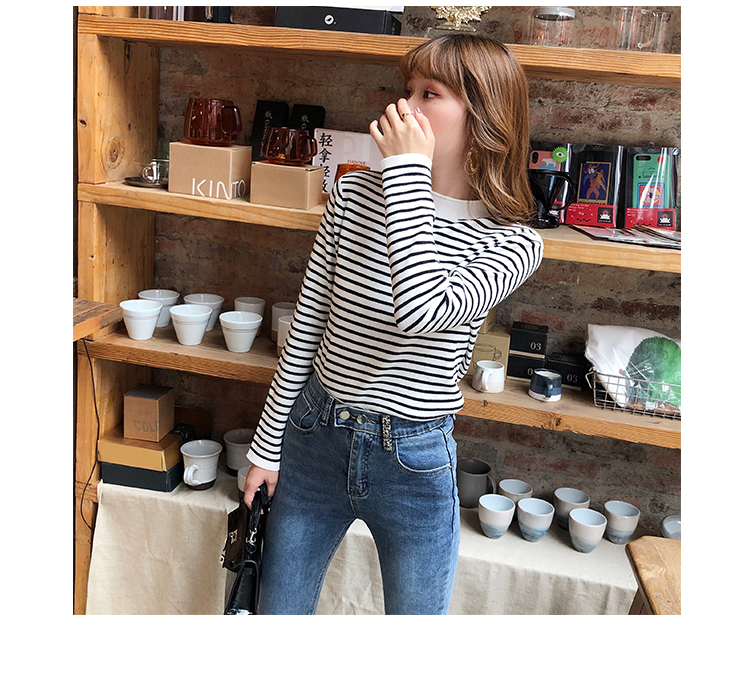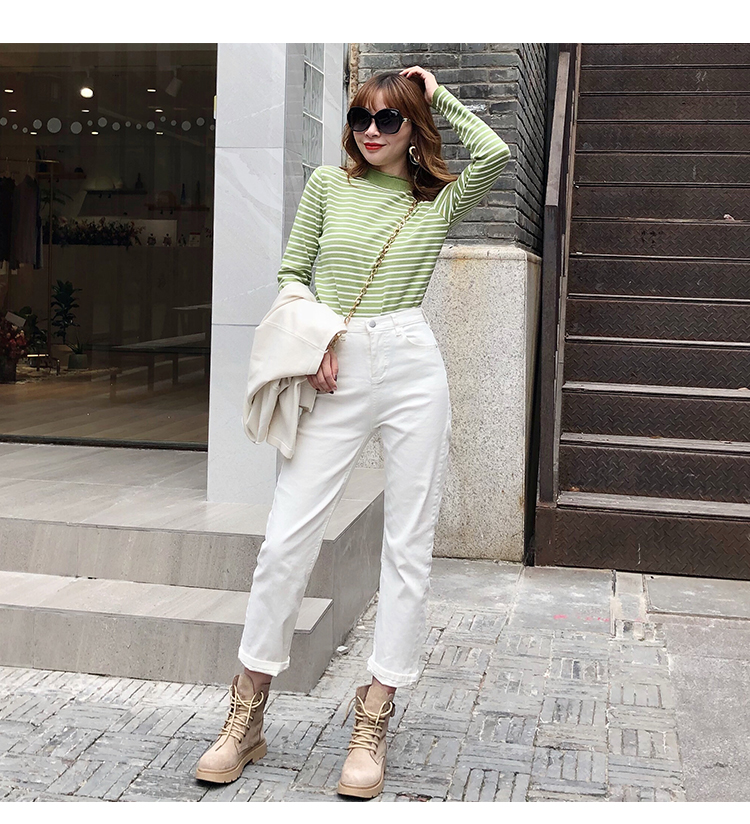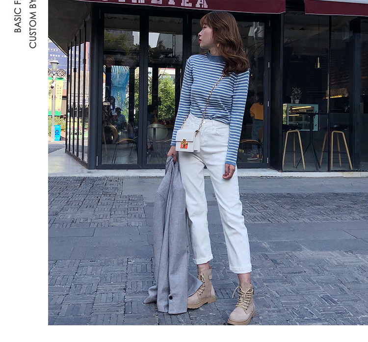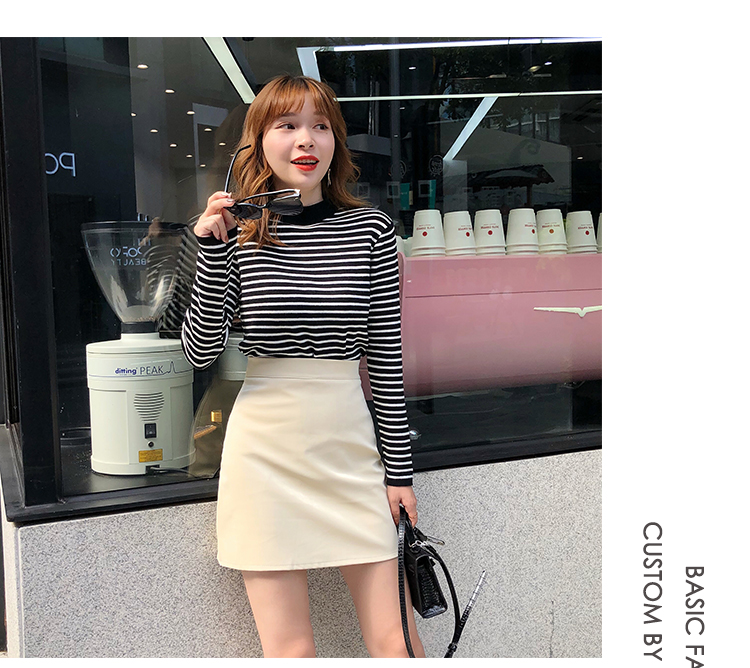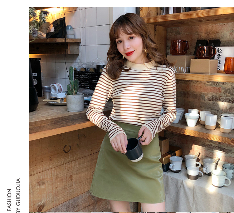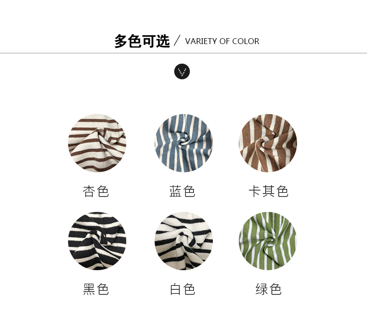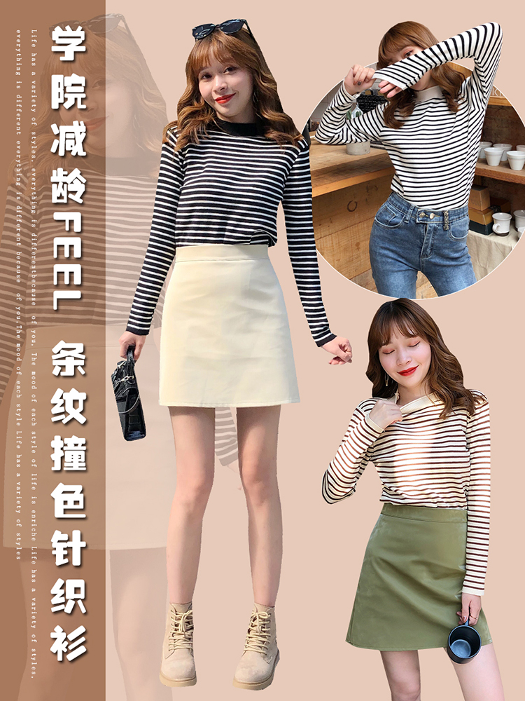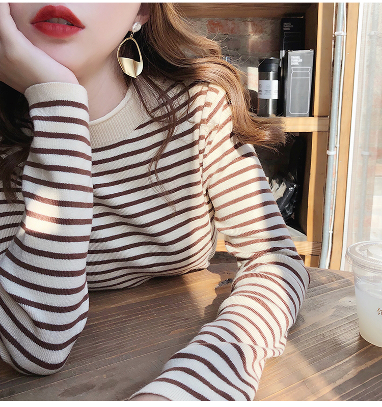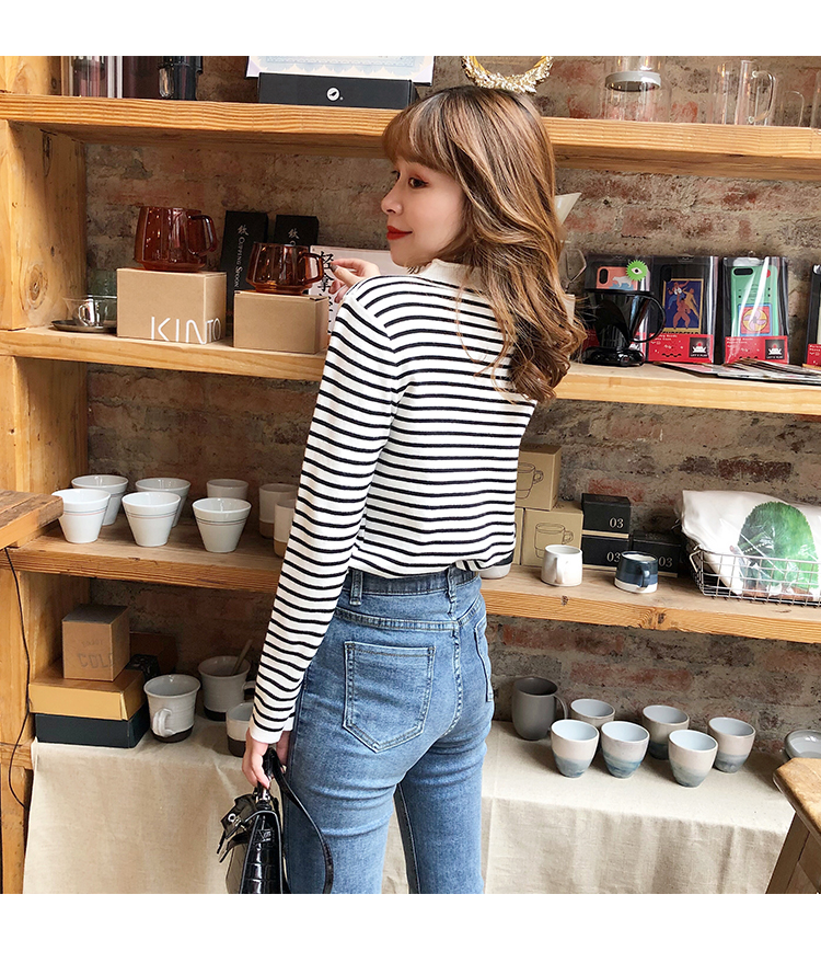 2019秋季新款半高領條紋針織衫女寬松套頭毛衣百搭韓版打底衫上衣1入