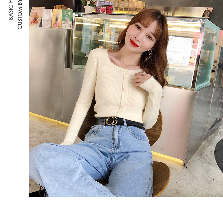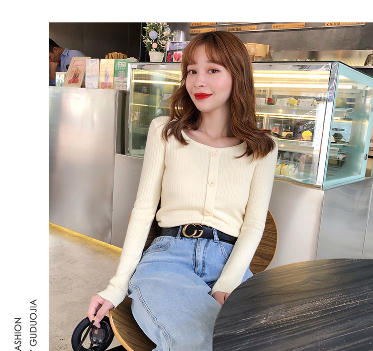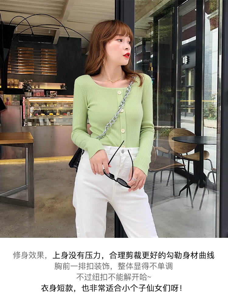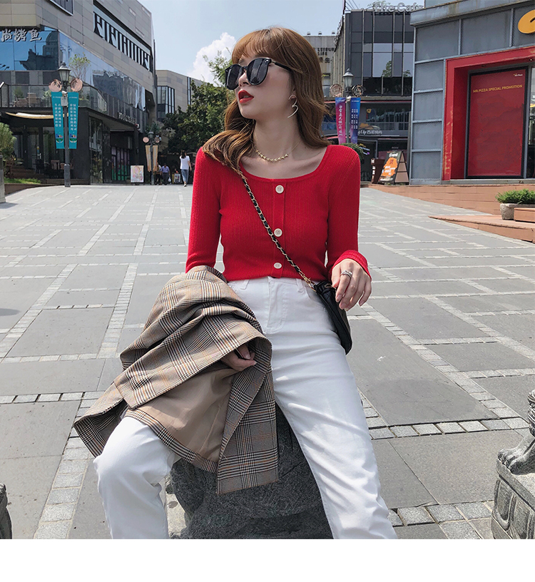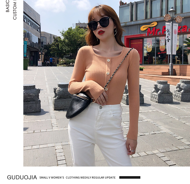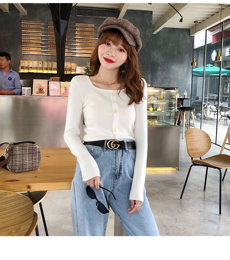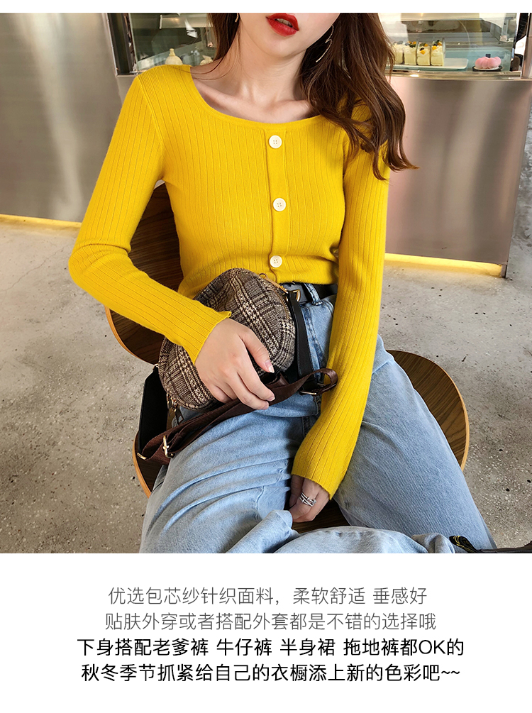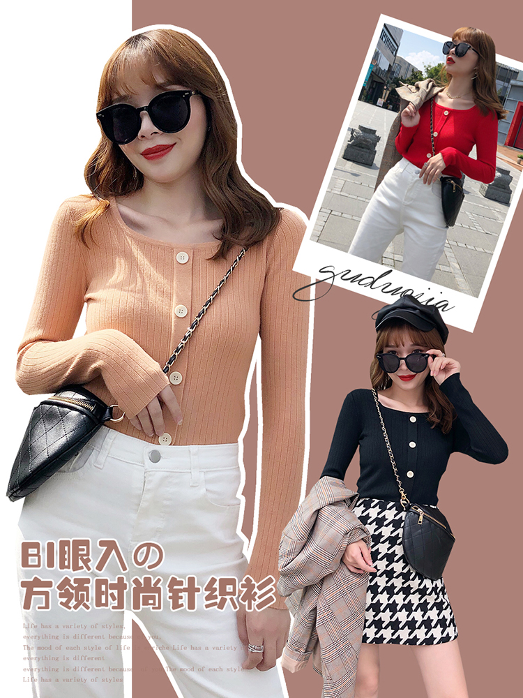 2019早秋季新款復古方領針織衫緊身短款打底衫長袖T恤百搭上衣潮1入