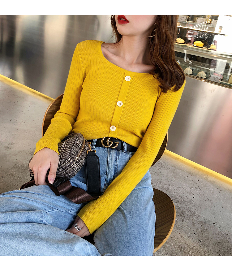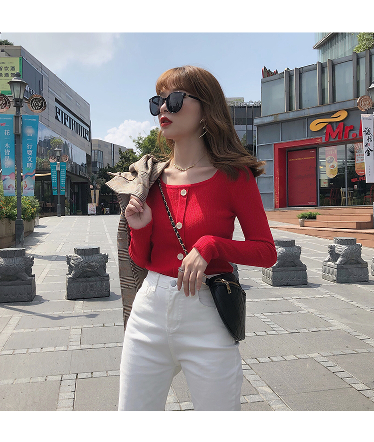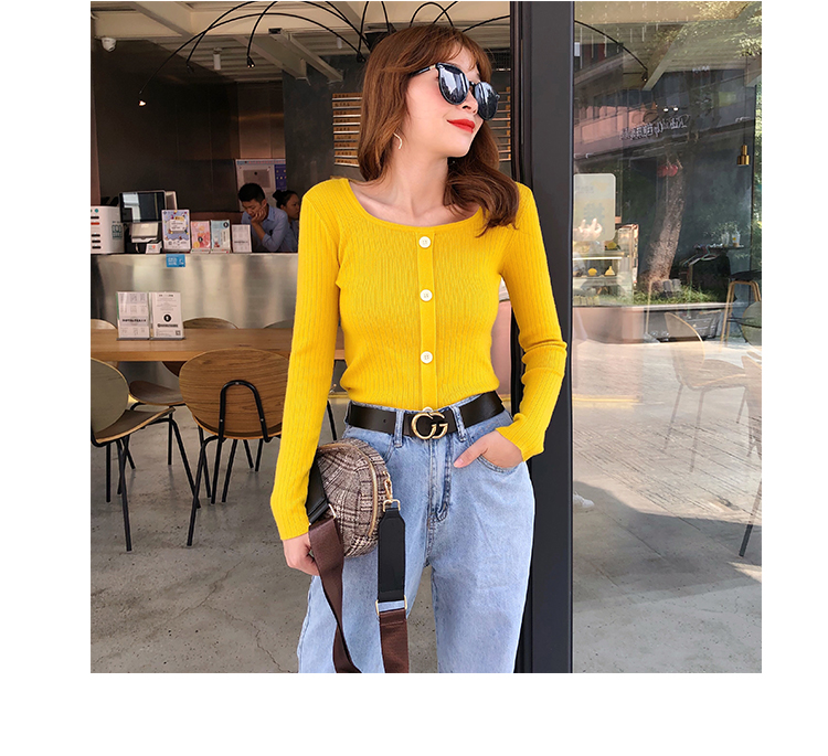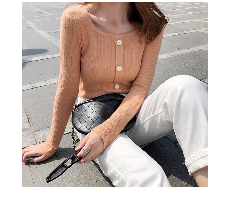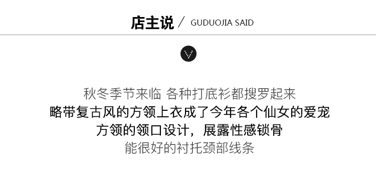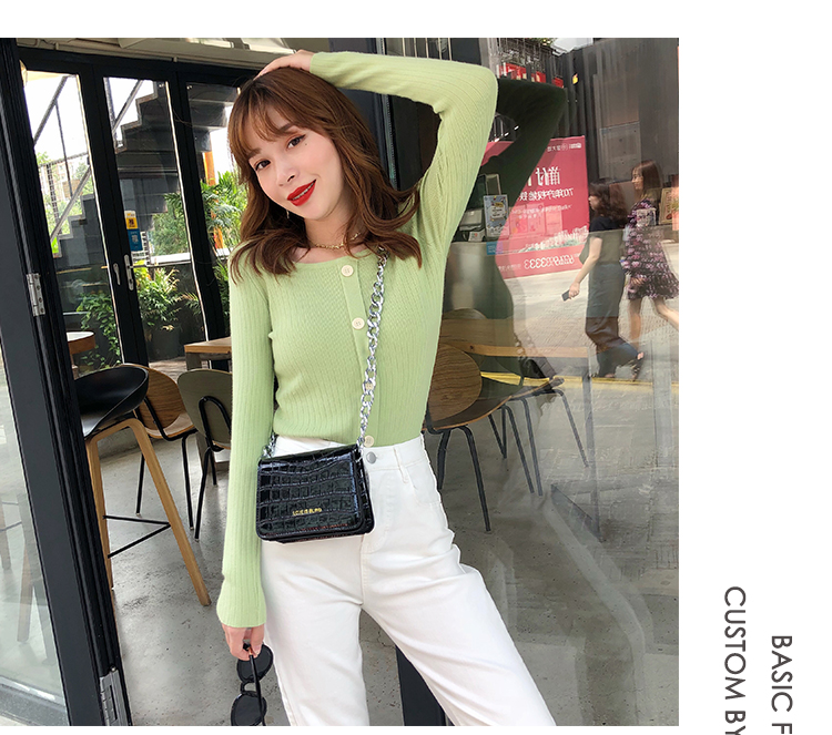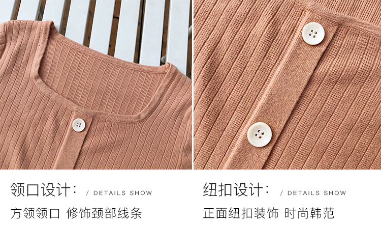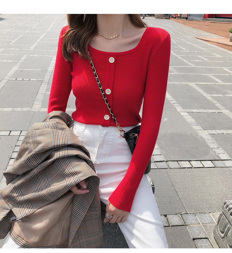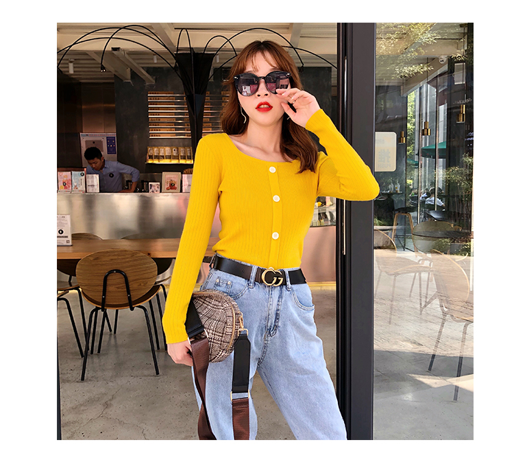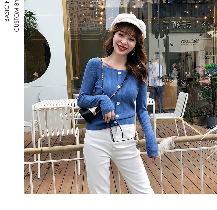 2019早秋季新款復古方領針織衫緊身短款打底衫長袖T恤百搭上衣潮1入