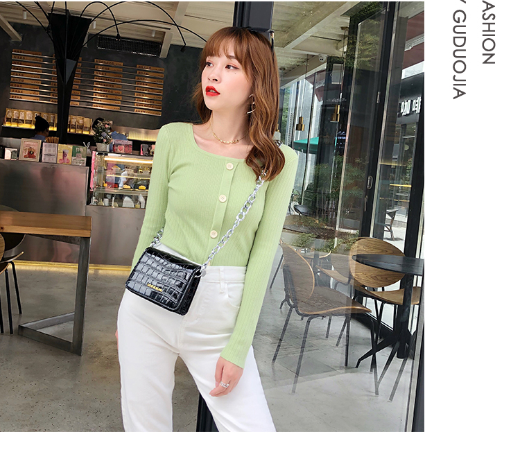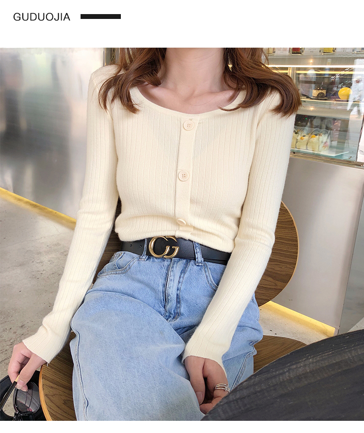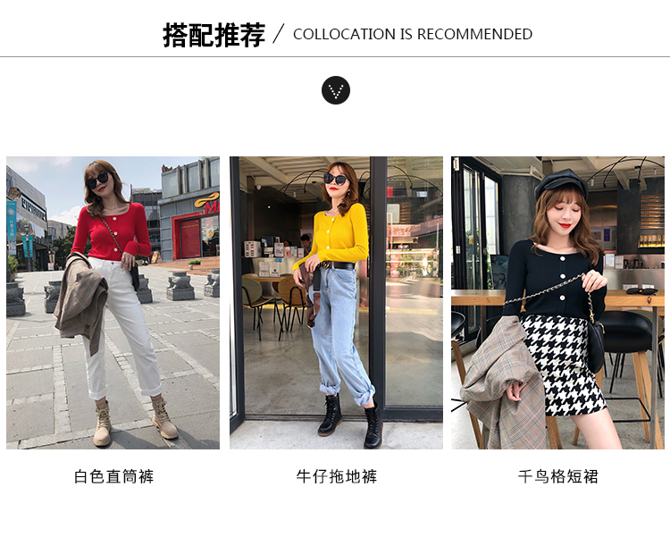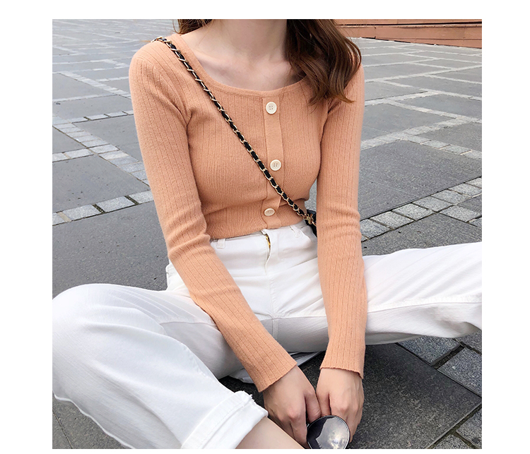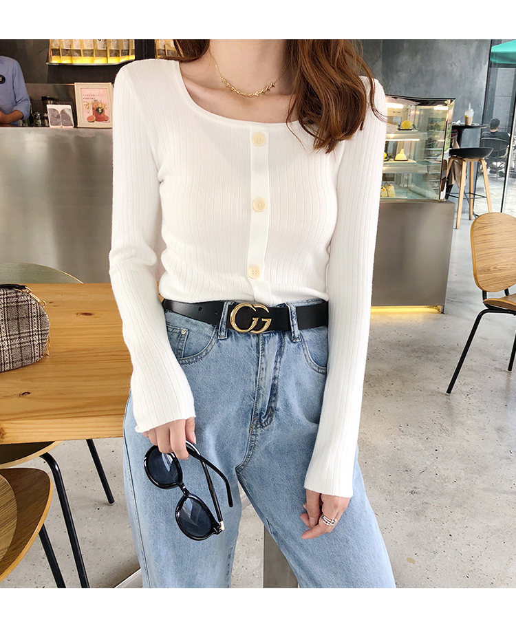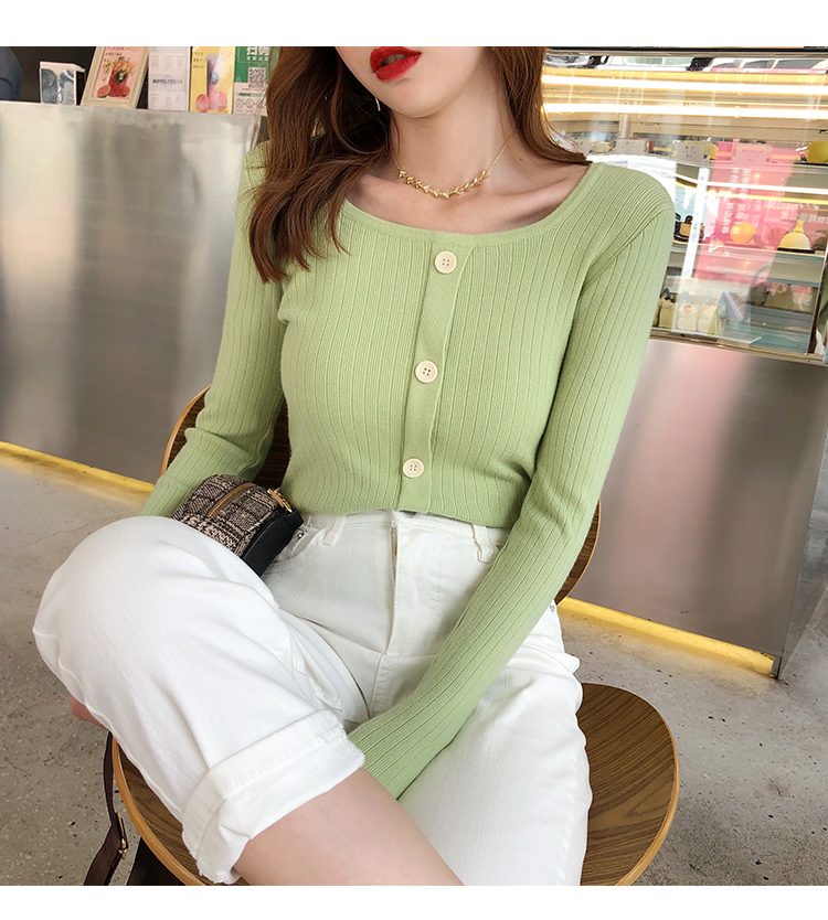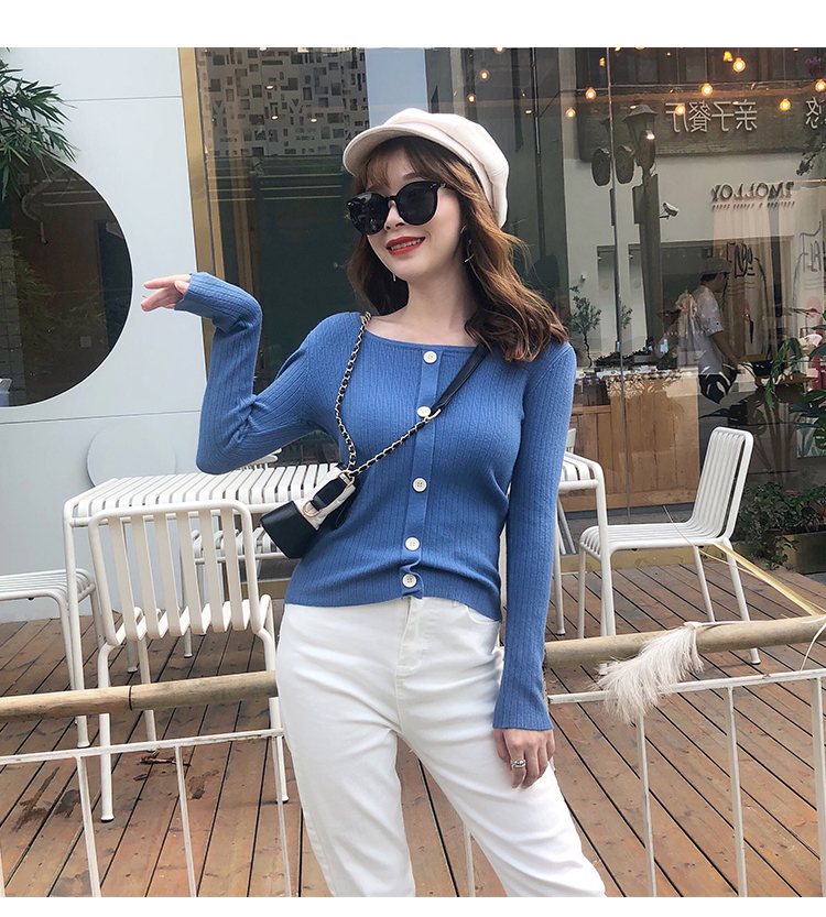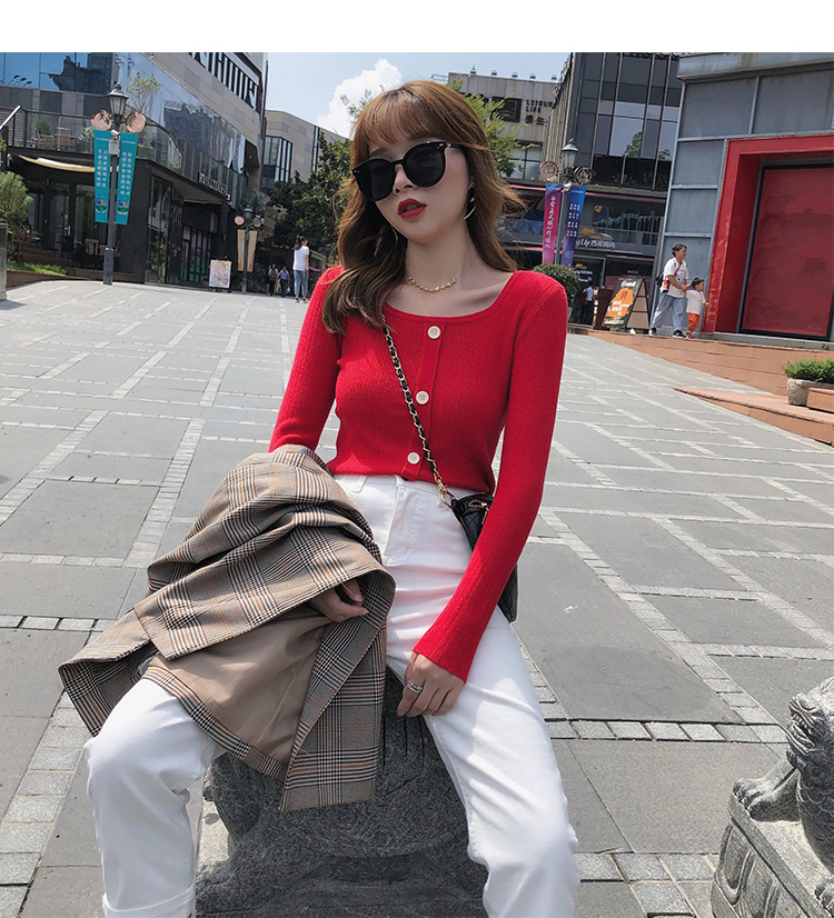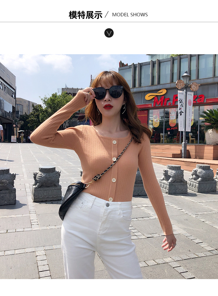 2019早秋季新款復古方領針織衫緊身短款打底衫長袖T恤百搭上衣潮1入