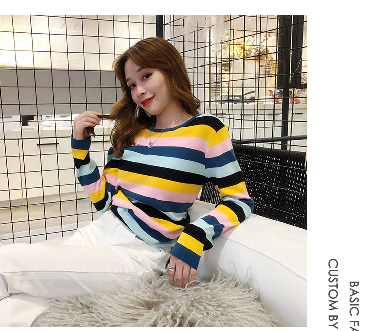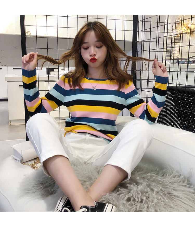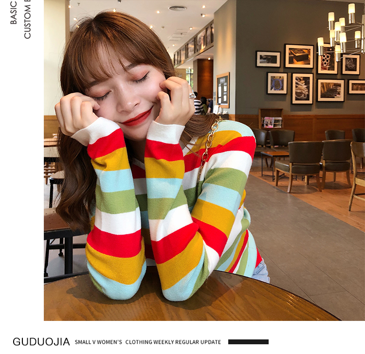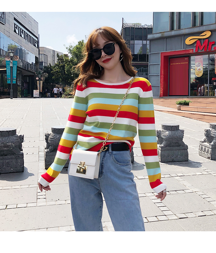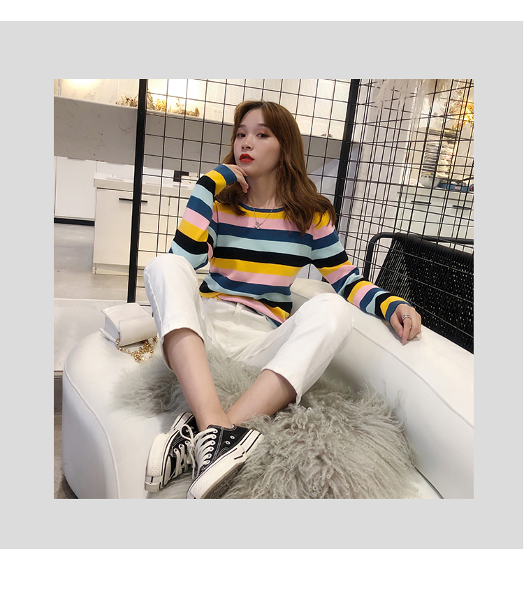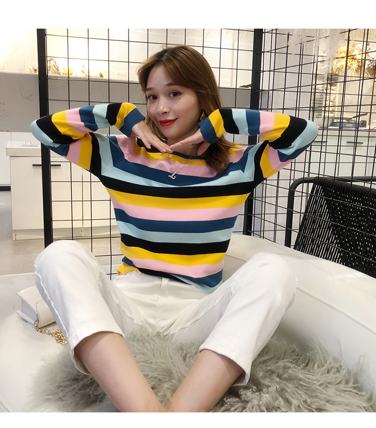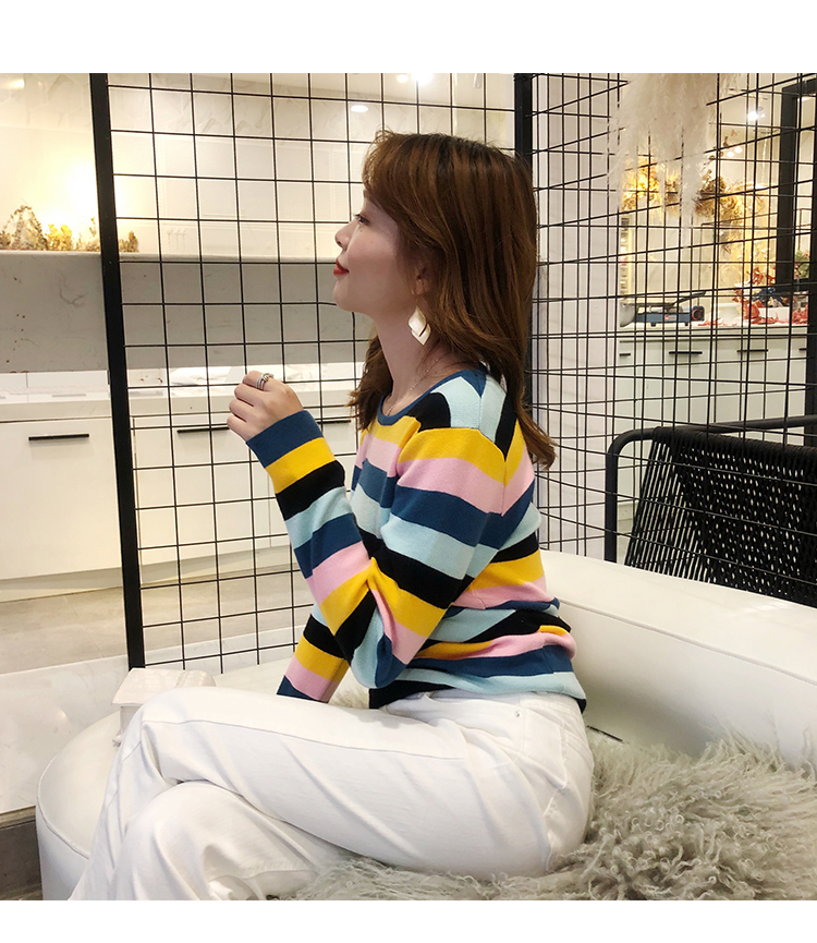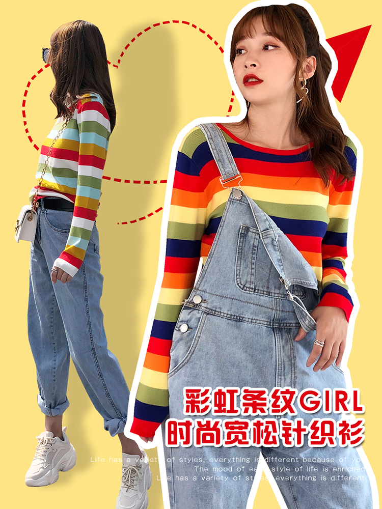 2019秋冬季新款寬松外穿套頭毛衣女彩虹條紋針織衫百搭打底衫上衣1入